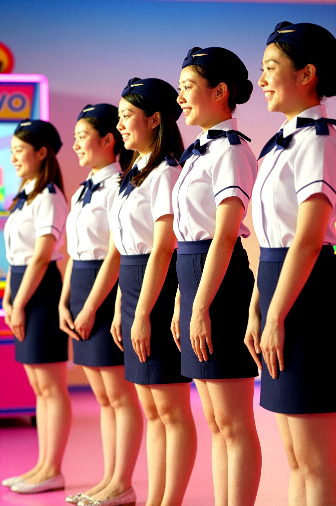 帽子とリボンが付いたお揃いの CA 客室乗務員風制服を着た笑顔の日本人女性 5 人が、鮮やかなピンク色の照明に照らされ、ゲームやエンターテイメントをテーマにしたカラフルなネオンの店内で陽気なグループコーディネートで一列に並んでいます。雰囲気はモダンでエキサイティングです。テキスト、文字、数字、書き込み、透かしは一切ありません。高画質でフリーのNightStock素材です。商用利用可能・クレジット表記不要。