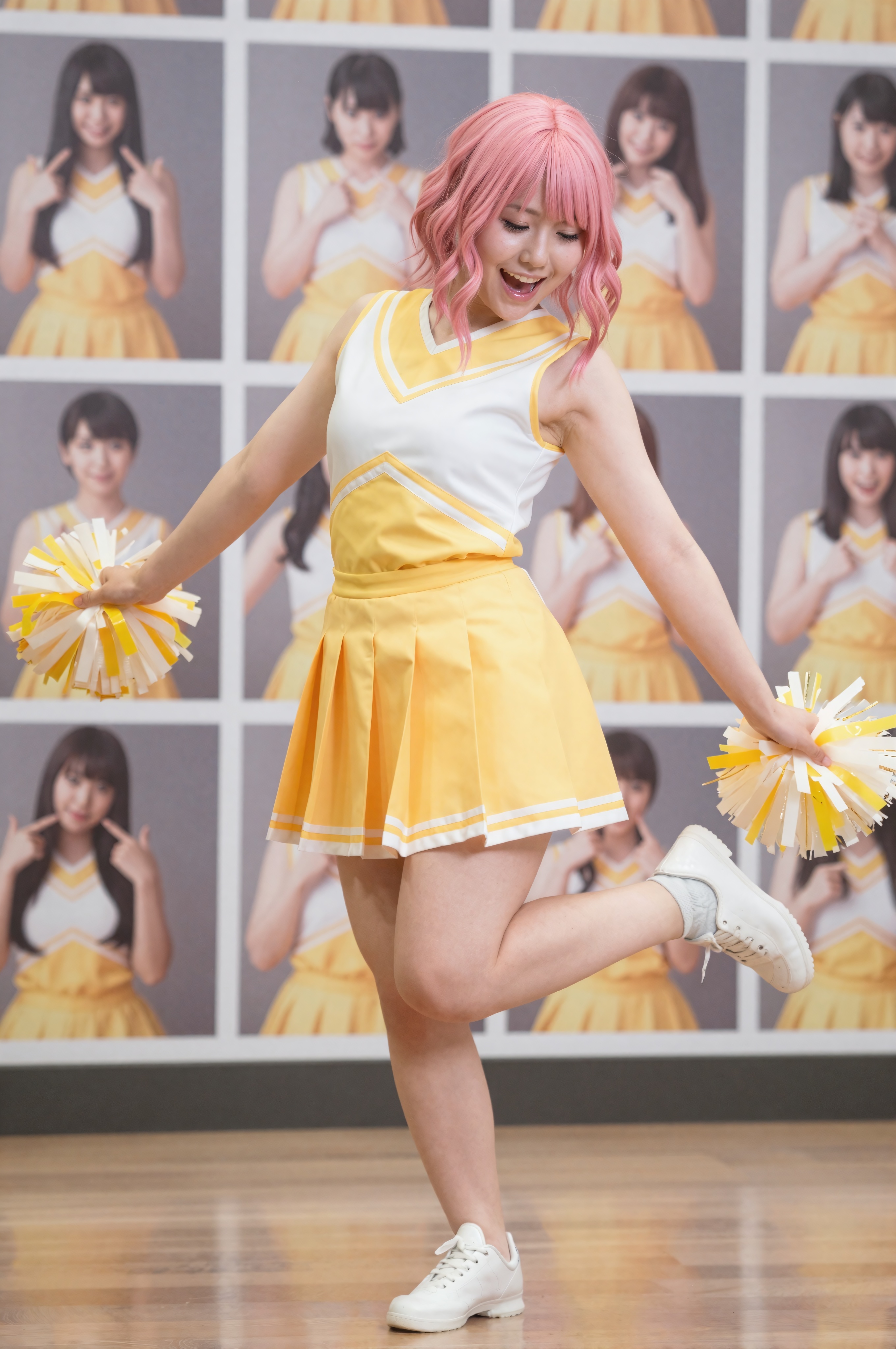 ウェーブのかかったピンク色の短い髪をした美しい日本人女性で、明るい黄色と白のチアリーダーのユニフォームを着て、プリーツスカートとポンポンを手に持っています。彼女は、コンセプトカフェのディスプレイボードに飾られた、おそろいの衣装を着たスタッフの大勢の集合写真の前に立って、片足を軽く上げ、腕を伸ばして元気いっぱいのポーズをとり、口を開けて明るく笑っている。テキスト、文字、数字、書き込み、透かしは一切あ。。高画質でフリーのNightStock素材です。商用利用可能・クレジット表記不要。