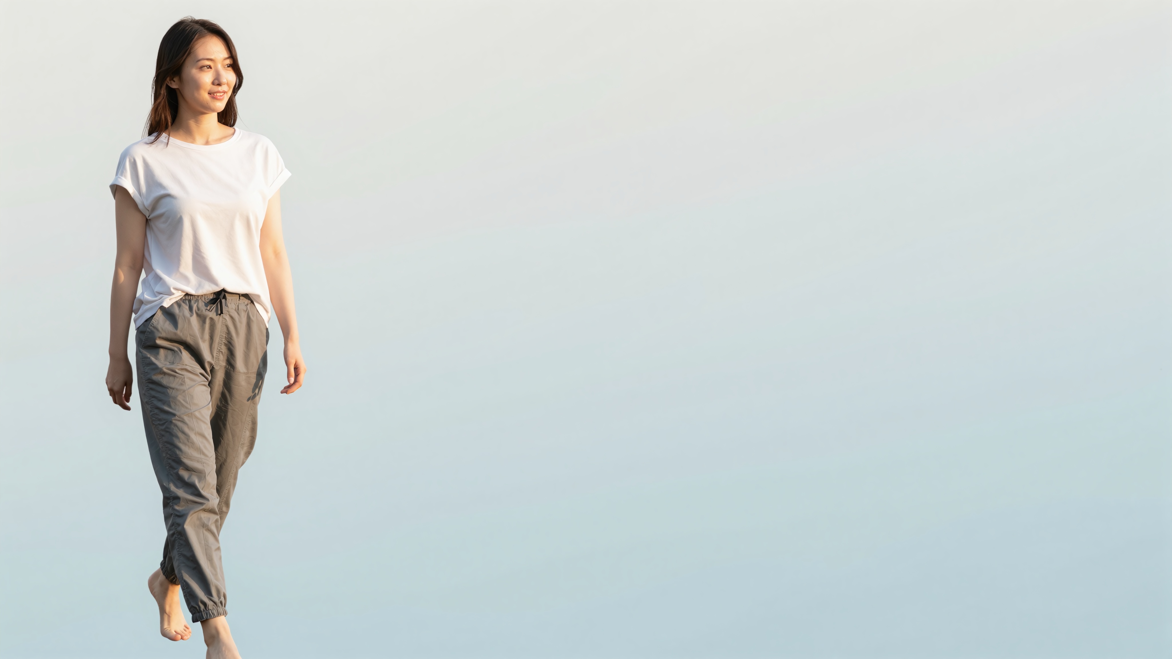 フレームの左端には美しい日本人女性が、穏やかで自信に満ちた表情で楽しそうに歩いています。彼女は快適なアスレジャーウェアを着ており、オフの日のセルフケアを提案しています。背景は温かみのあるクリームから白のグラデーションで、繊細で高級感のある模様の装飾が施されており、リラックスしながら洗練された雰囲気を高めています。重要な右側はクリアで、十分なテキストスペースが確保されています。。高画質でフリーのNightStock素材です。商用利用可能・クレジット表記不要。