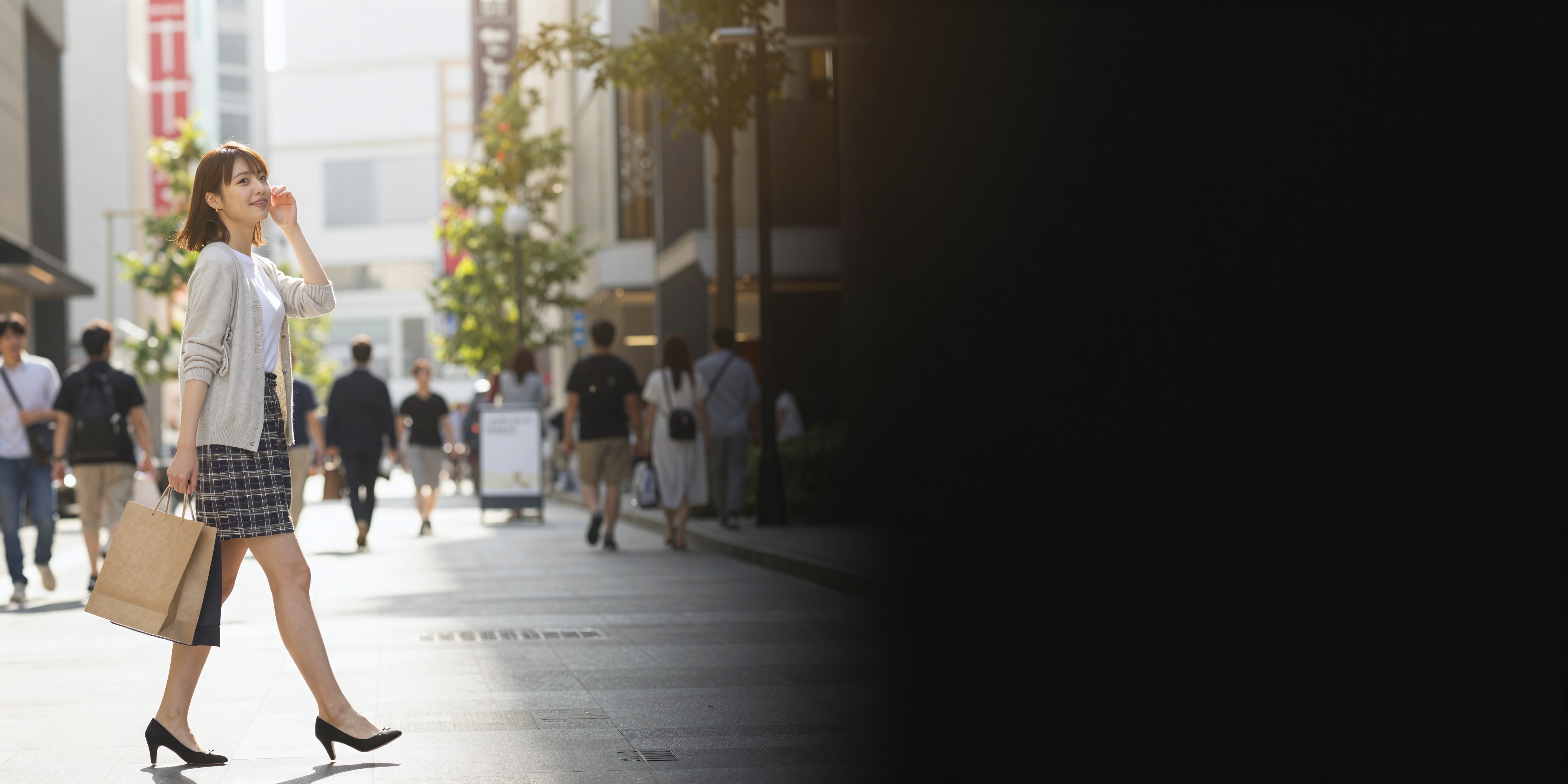 デザイナーのファッション衣装やブランドのショッピングバッグを持ち、トレンディーな商店街を歩く美しい日本人女性がダイナミックなポーズで捉えられています。明るく爽やかな日差しの下、通りは微妙な賑わいで賑わっています。左側は、明るく温かみのある金色から白へのグラデーションで構成され、微妙な輝きのオーバーレイがダイナミックで意欲的なシーンを作り出しています。。高画質でフリーのNightStock素材です。商用利用可能・クレジット表記不要。