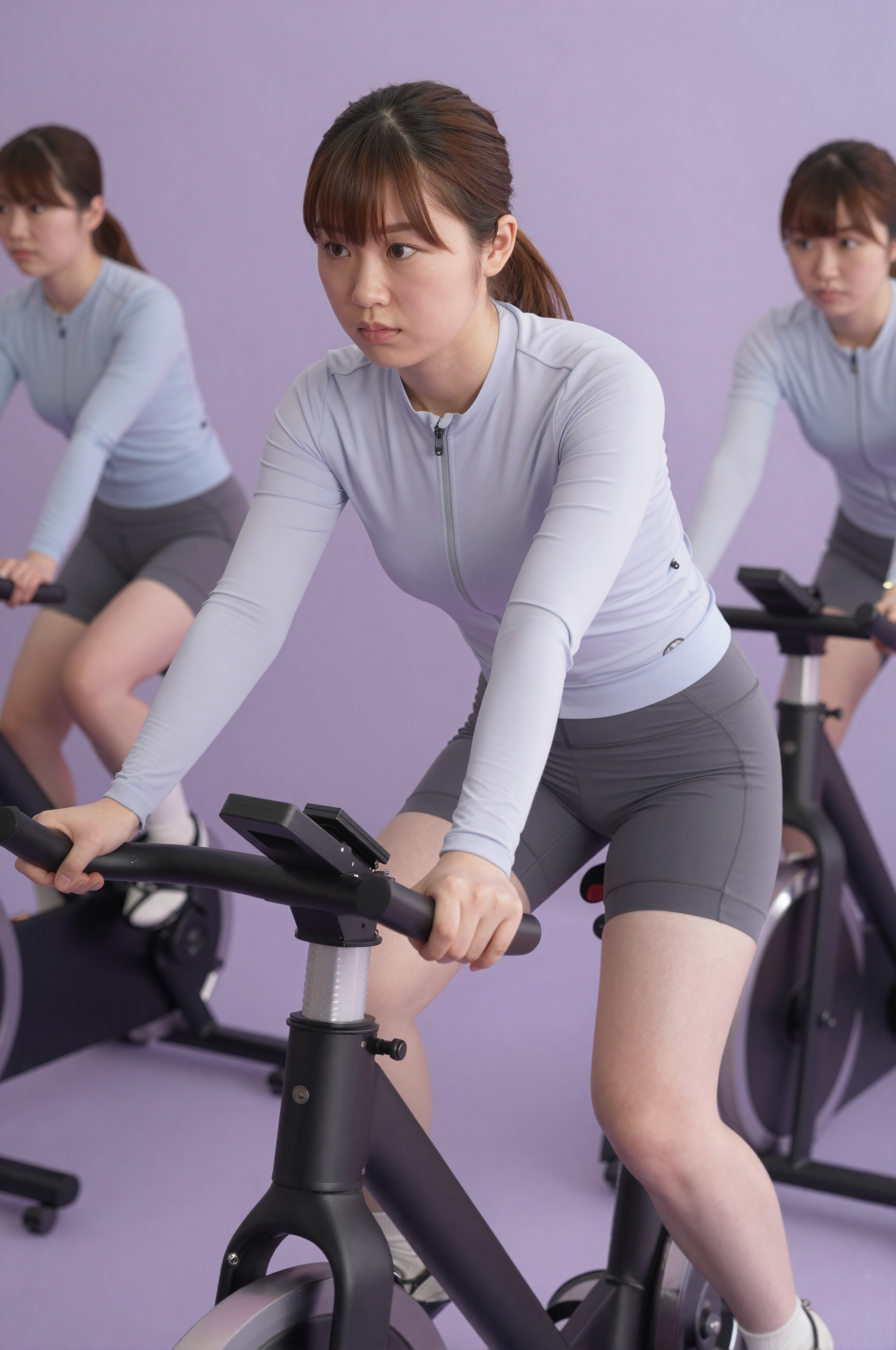 エアロバイクが並ぶ設備の整ったスピニングスタジオで、吸湿発散性に優れた長袖サイクルジャージとパッド入りサイクルショーツを着た日本人女性が、決意を固めエネルギーに満ちた表情でスピニングのクラスに集中していた。スタジオは活気に満ちた、やる気を起こさせるアンビエント照明で照らされています。。高画質でフリーのNightStock素材です。商用利用可能・クレジット表記不要。