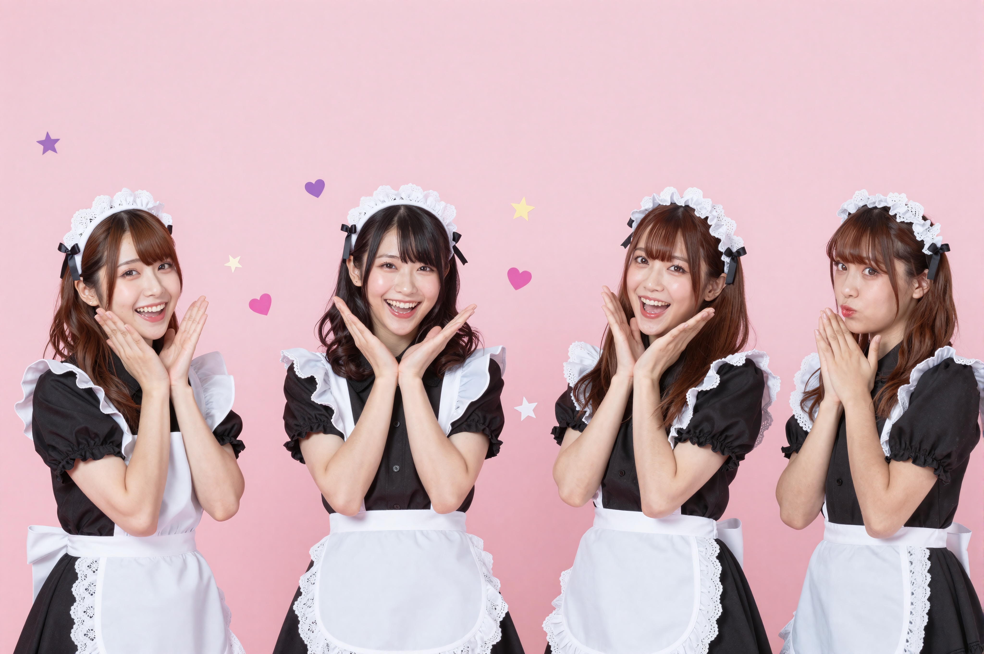 ダークカラーとレースのディテールを備えたゴシックメイドの衣装を着た 4 人の日本人女性が、星、ハート、リボンなどのカワイイ装飾が散りばめられた陽気な明るいピンクの背景に対して代替のキュートなポーズをとり、独特のポップでカワイイ雰囲気を作り出しています。テキスト、文字、数字、書き込み、透かしは一切ありません。。高画質でフリーのNightStock素材です。商用利用可能・クレジット表記不要。