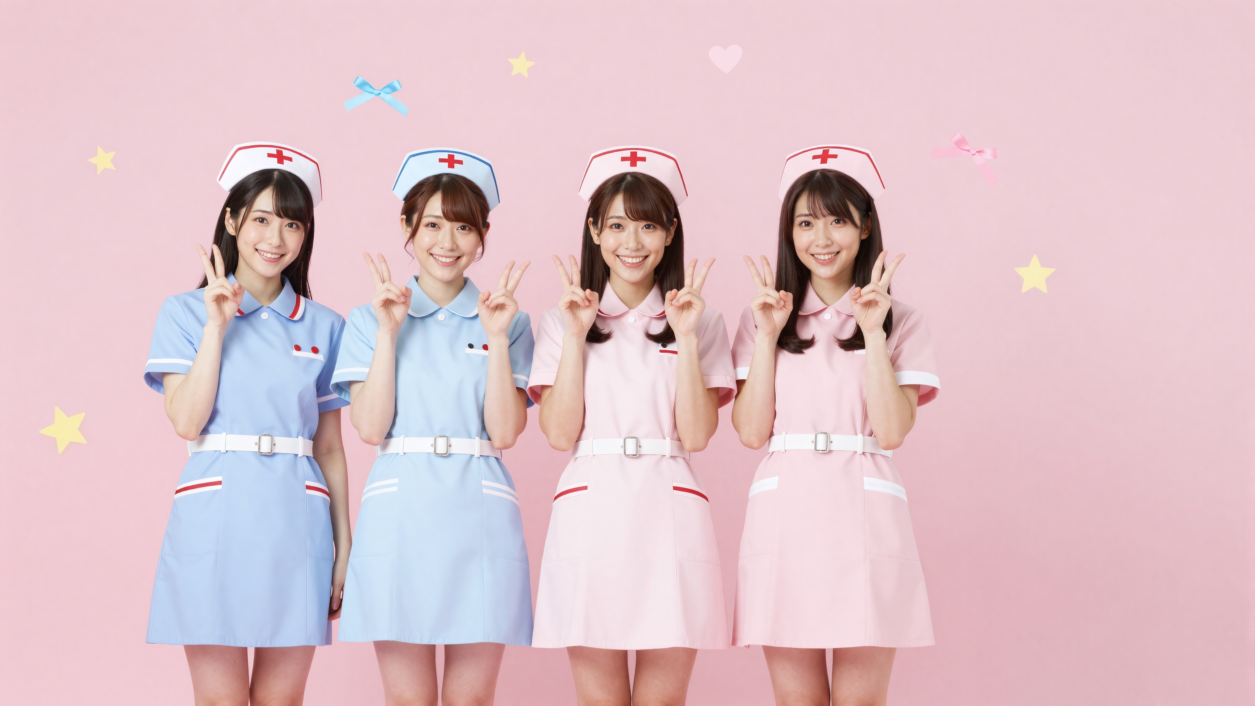 看護師または学生服風のコスプレをした 3 人の日本人女性のグループ。かわいいテーマのお揃いの衣装を着て、星、ハート、リボンなどのかわいい装飾が散りばめられた陽気な明るいピンクの背景にピースサインと猫の足のポーズをとって並んでいます。文字、文字、数字、書き込み、透かしは一切ありません。。高画質でフリーのNightStock素材です。商用利用可能・クレジット表記不要。