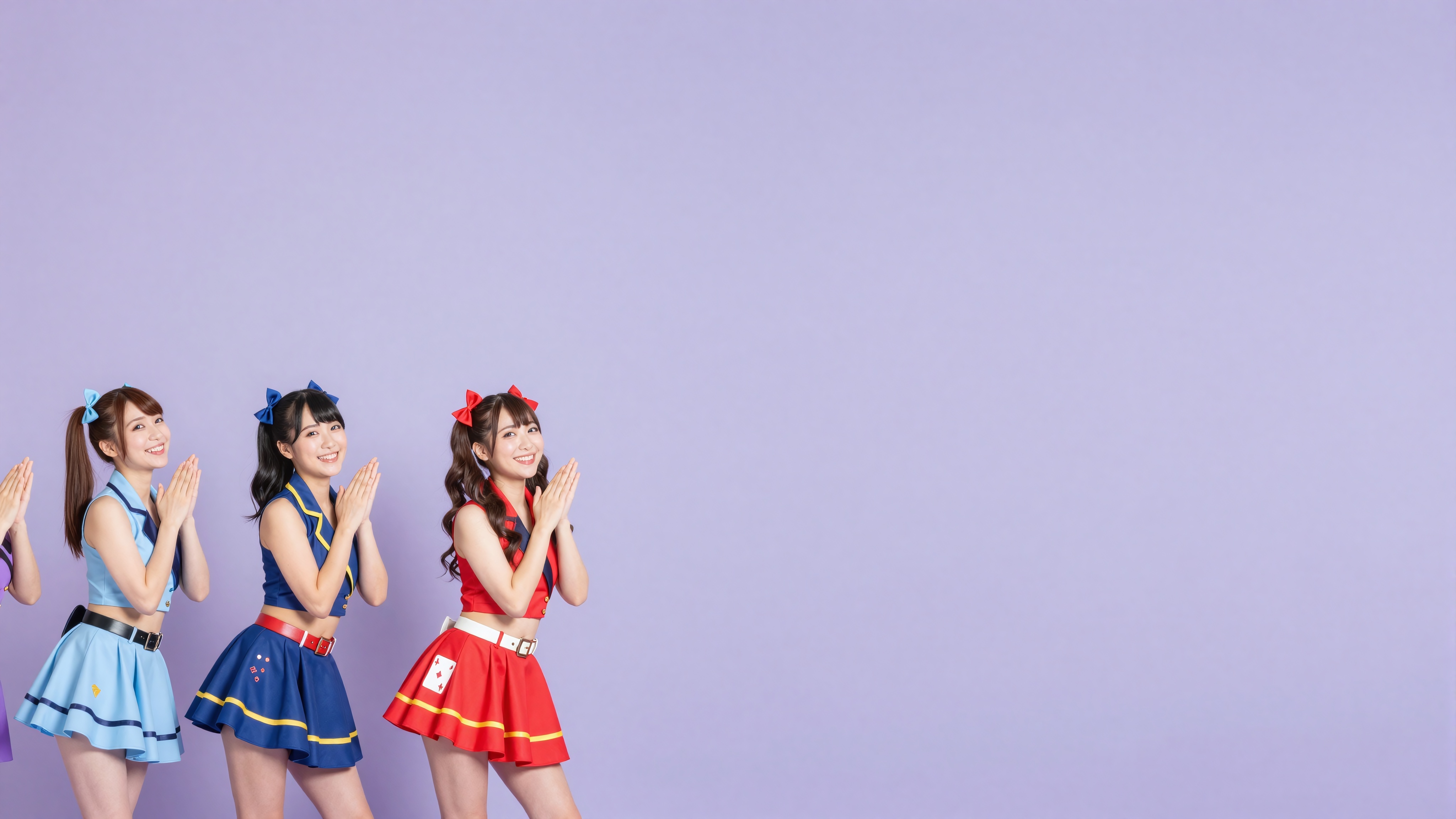 カラフルなネオンとカードスーツの装飾が施されたカジノ/エンターテイメントスタイルの背景で、コーディネートされたヘアアクセサリーとウィッグを付けたアイドルスタイルのカラフルな衣装を着た4人の日本人女性がシンクロしてかわいいポーズをとっている。テキスト、文字、数字、書き込み、透かしは一切含まれていない。高画質でフリーのNightStock素材です。商用利用可能・クレジット表記不要。