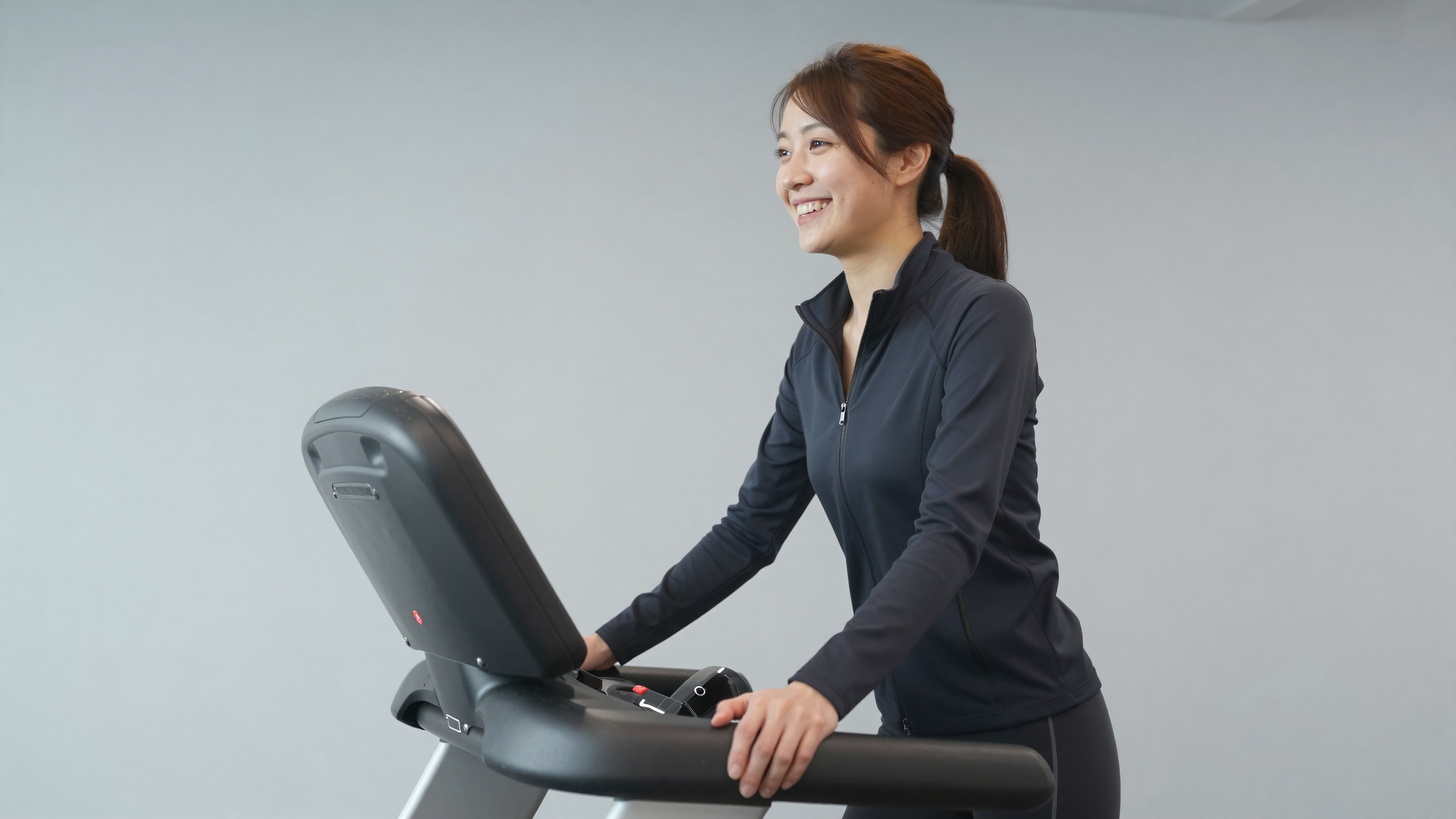 カーディオマシンを備えたモダンなジムで、フルジップのアスレチックジャケットとトラックパンツを着て、適度なペースでトレッドミルを操作し、わずかなえくぼが見える温かい本物の笑顔、明るく均一なジムの照明を備えた日本人女性。 (SFW: 胸の谷間なし、過度の肌の露出なし、SFW ルールに従って完全着衣)。高画質でフリーのNightStock素材です。商用利用可能・クレジット表記不要。