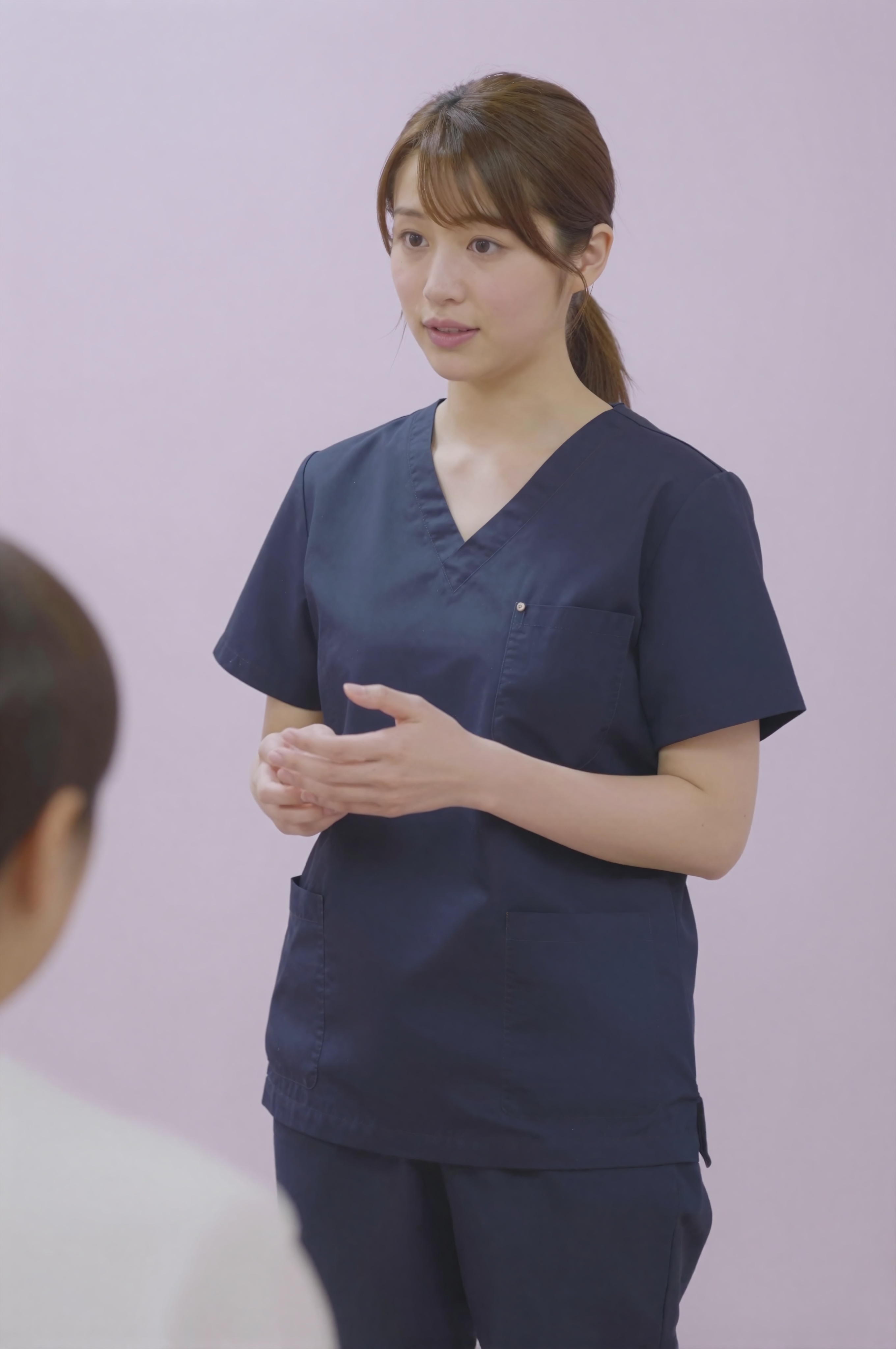 病院の廊下で、きちんとしたネイビーブルーの医療用スクラブを着て患者の家族と相談している日本人女性。温かく協力的な周囲の照明の下で、共感的で有益な表情で優しく身振りで示し、明確なコミュニケーションと感情的なサポートを育んでいる。。高画質でフリーのNightStock素材です。商用利用可能・クレジット表記不要。