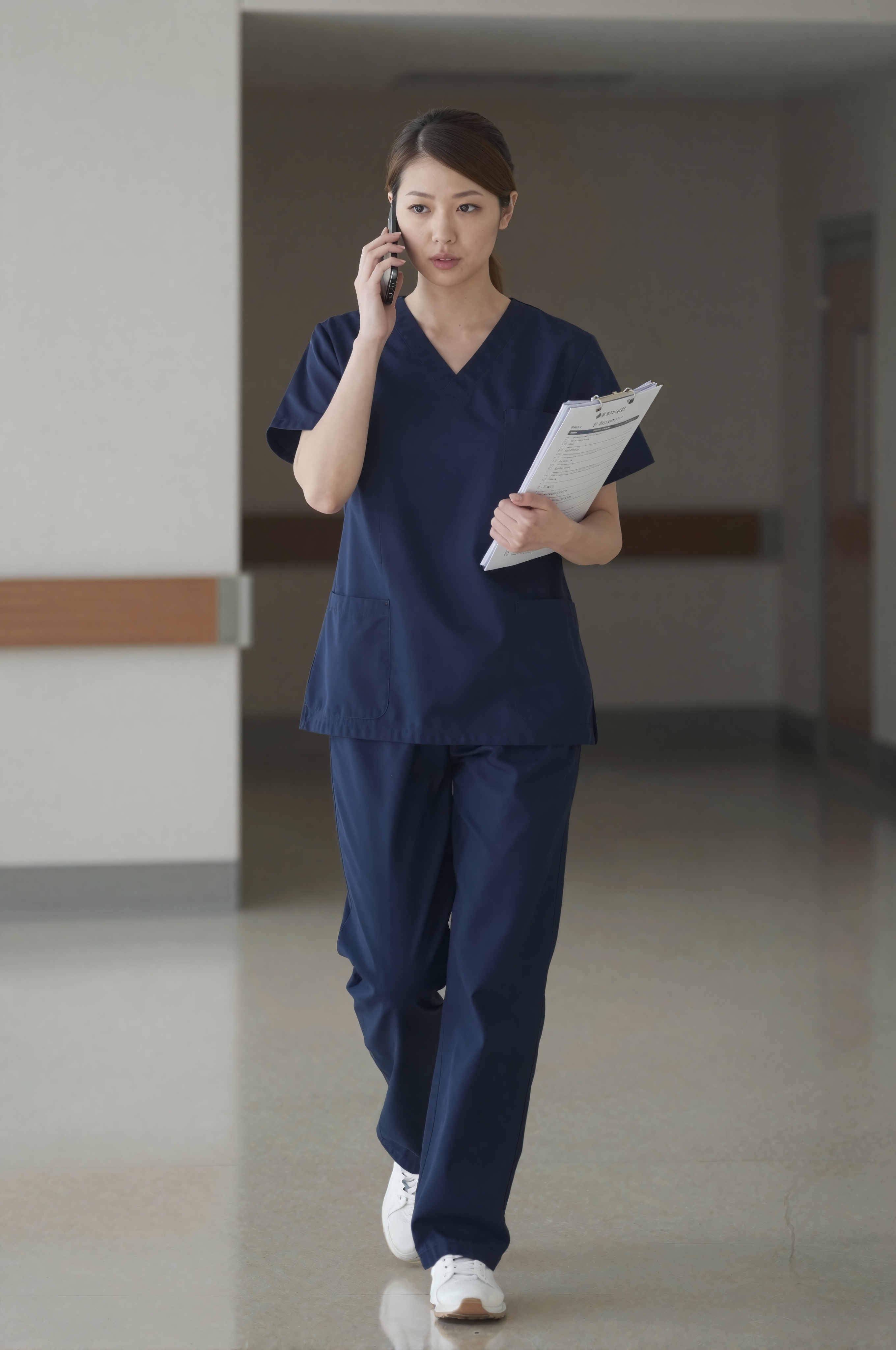 病院の廊下を早足で歩き、カルテとスマートフォンを持ち、ぴったりとしたネイビーブルーの医療用スクラブを着た日本人女性。明るく機能的な病院の照明の下で、真剣で集中した表情で素早く電話をかけており、多忙で責任感のある専門家であることが伝わってくる。。高画質でフリーのNightStock素材です。商用利用可能・クレジット表記不要。