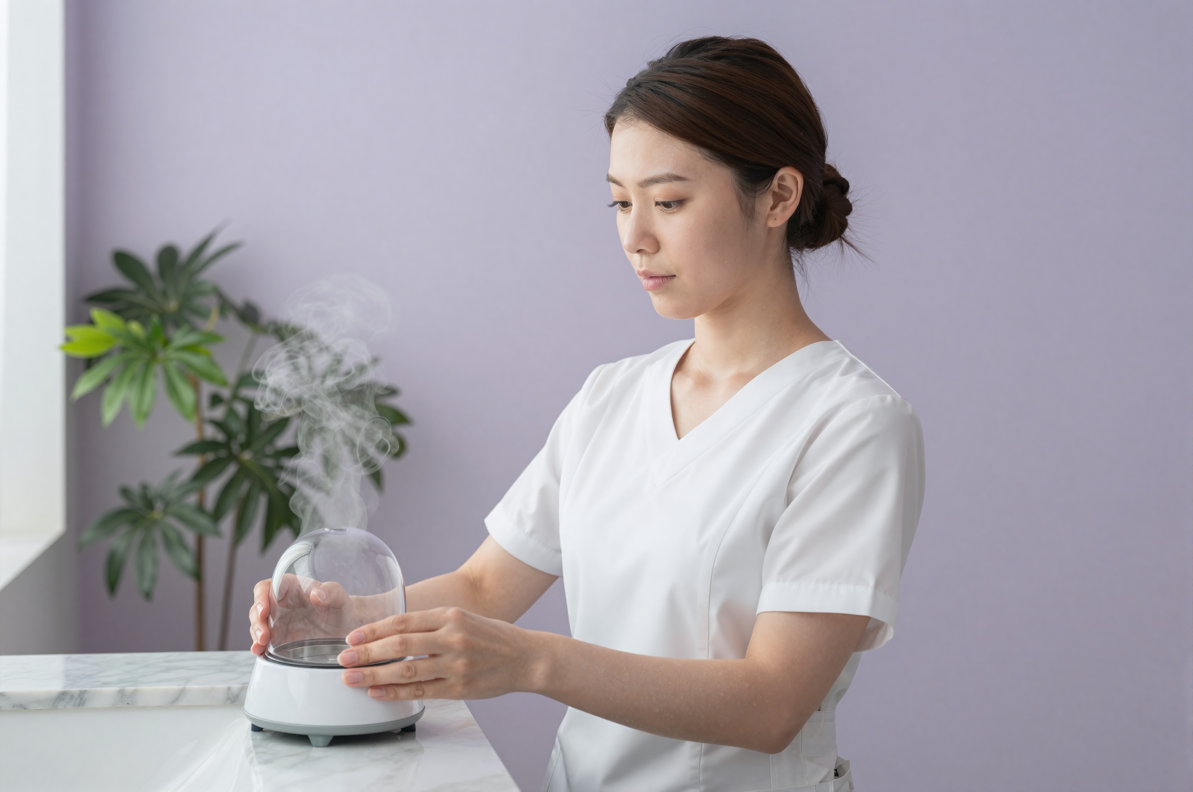 プロのエステティシャンの白い制服を着た日本人女性が、大理石のカウンタートップと緑豊かな植物が置かれた明るくモダンなバスルームで、フェイシャルスチーマーを注意深く準備しています。彼女の表情は穏やかで注意深く、正確さと配慮を示しています。蒸気がふわりと立ち上り、ふんわりとした幻想的な雰囲気を醸し出しています。柔らかく自然な窓の光がバスルームに差し込み、きれいな表面と新鮮な緑を強調します。。高画質でフリーのNightStock素材です。商用利用可能・クレジット表記不要。