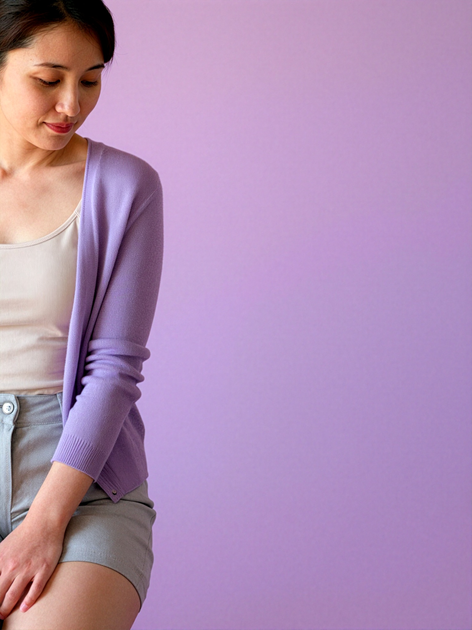 クリーム色のキャミソールとライトグレーのテーラードショーツの上に柔らかなラベンダーのニットカーディガンを着た日本人女性がさりげなく左端に位置し、思索的で優しい表情で見下ろしている。彼女の体の一部しか見えません。背景はきれいなパステル調の紫から明るいピンクのグラデーションで、微妙なテクスチャーが施され、ほとんど虹色に輝く仕上げが施されており、広大で落ち着いた空白のスペースを提供しています。柔らかな朝。。高画質でフリーのNightStock素材です。商用利用可能・クレジット表記不要。