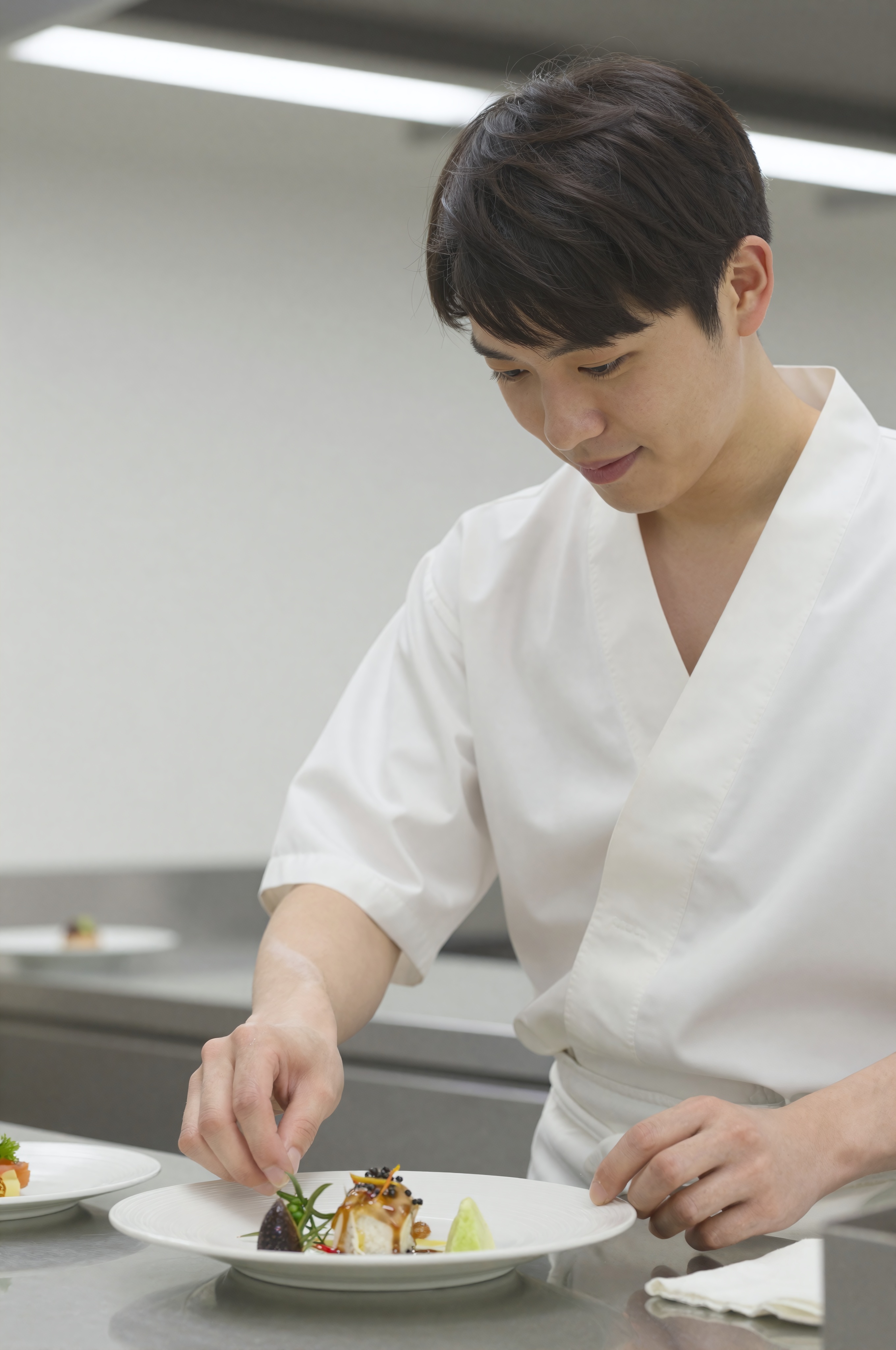 清潔な白い制服を着たホテルのシェフである日本人男性が、明るいキッチンで繊細な付け合わせを盛り込んだ皿を準備している。彼の手は機敏で集中力があり、料理に最終的な芸術的なタッチを加えます。ステンレスのカウンターに新鮮な食材が整然と並べられています。頭上の蛍光灯が鮮明な照明を提供します。。高画質でフリーのNightStock素材です。商用利用可能・クレジット表記不要。