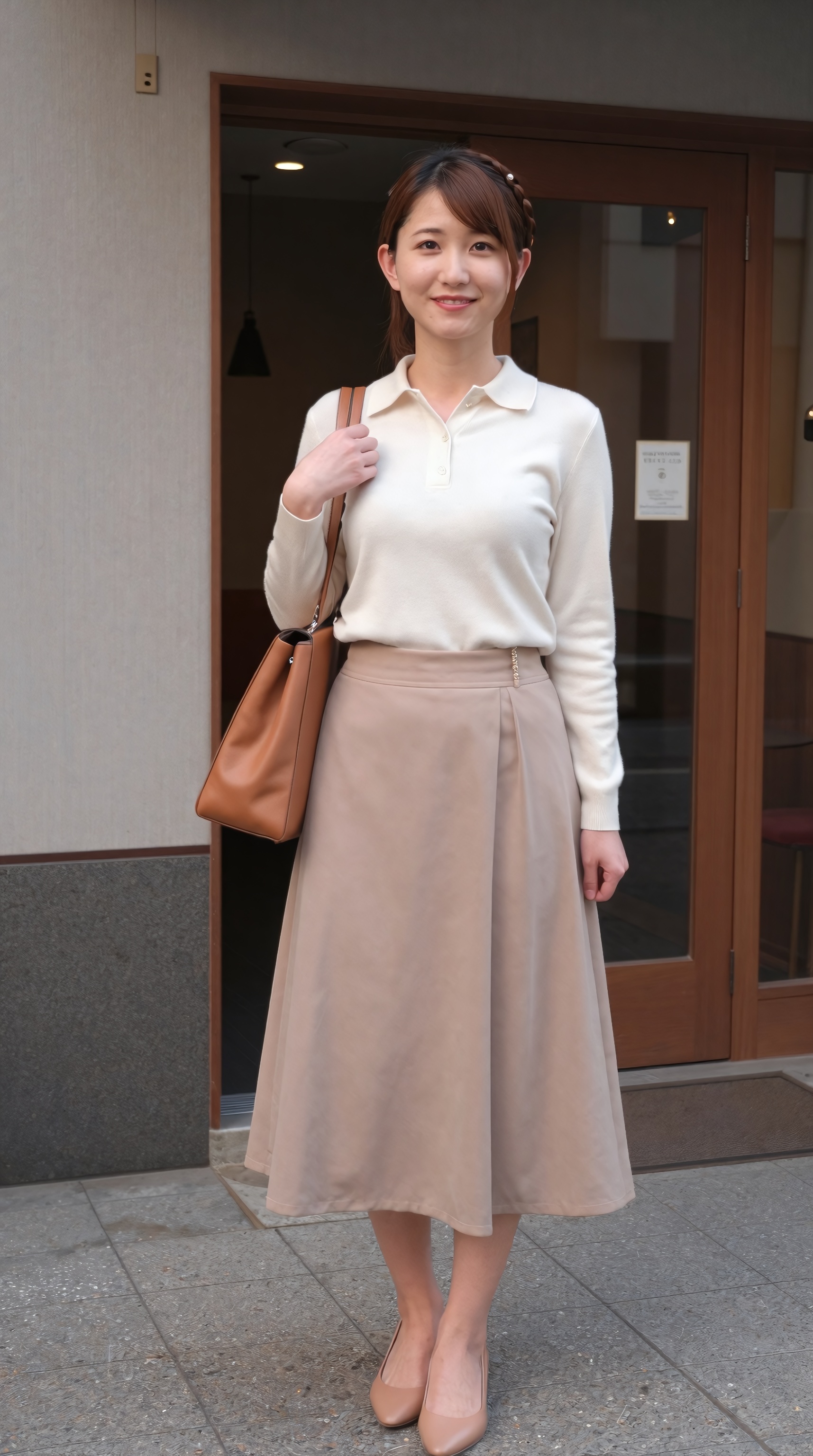 美しい日本人女性。若い日本人女性が東京のカフェの前の街の歩道に微笑みながら立っており、彼女の視線はカメラから少し離れたところに向けられており、温かく楽しい表情を浮かべています。彼女は、長袖のクリーム色のニット ポロ シャツを、脚の周りに柔らかなひだを作る軽量で流れるような生地で作られたハイウエストの膝丈のベージュのスカートにタックインして着ています。彼女の衣装は、ヌードの尖ったつま先のヒールと、体。。高画質でフリーのNightStock素材です。商用利用可能・クレジット表記不要。