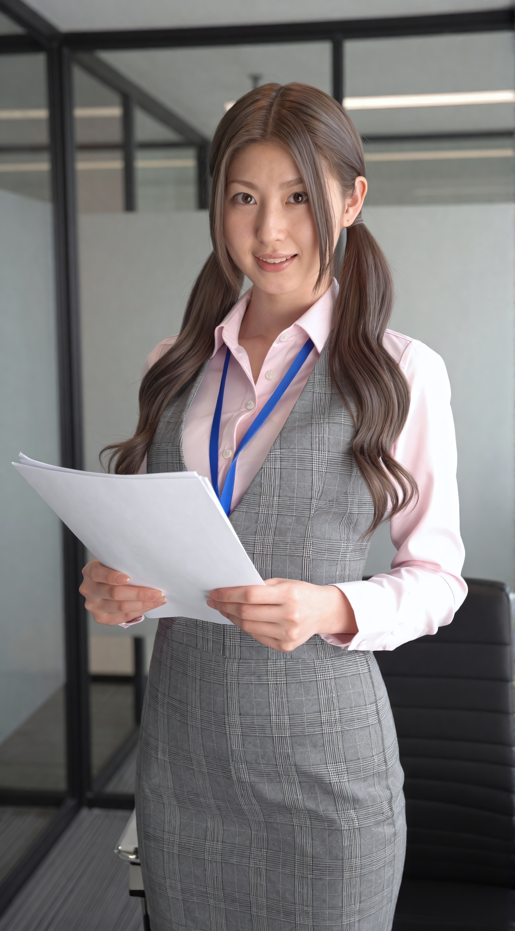 美しい日本人女性。ガラスの壁と天井の蛍光灯が備わったモダンなオフィス環境で、若い日本人女性が白い紙の束を持ちながらカメラに向かって温かく微笑みながら立っています。彼女は茶色のストレートなロングヘアを真ん中で分けており、太ももの真ん中まで届くグレーのチェック柄のペンシルスカートに、ライトピンクのボタンダウンシャツをタックインして着ています。シャツの上に、彼女はぴったりとフィットする、それと一致するグ。。高画質でフリーのNightStock素材です。商用利用可能・クレジット表記不要。