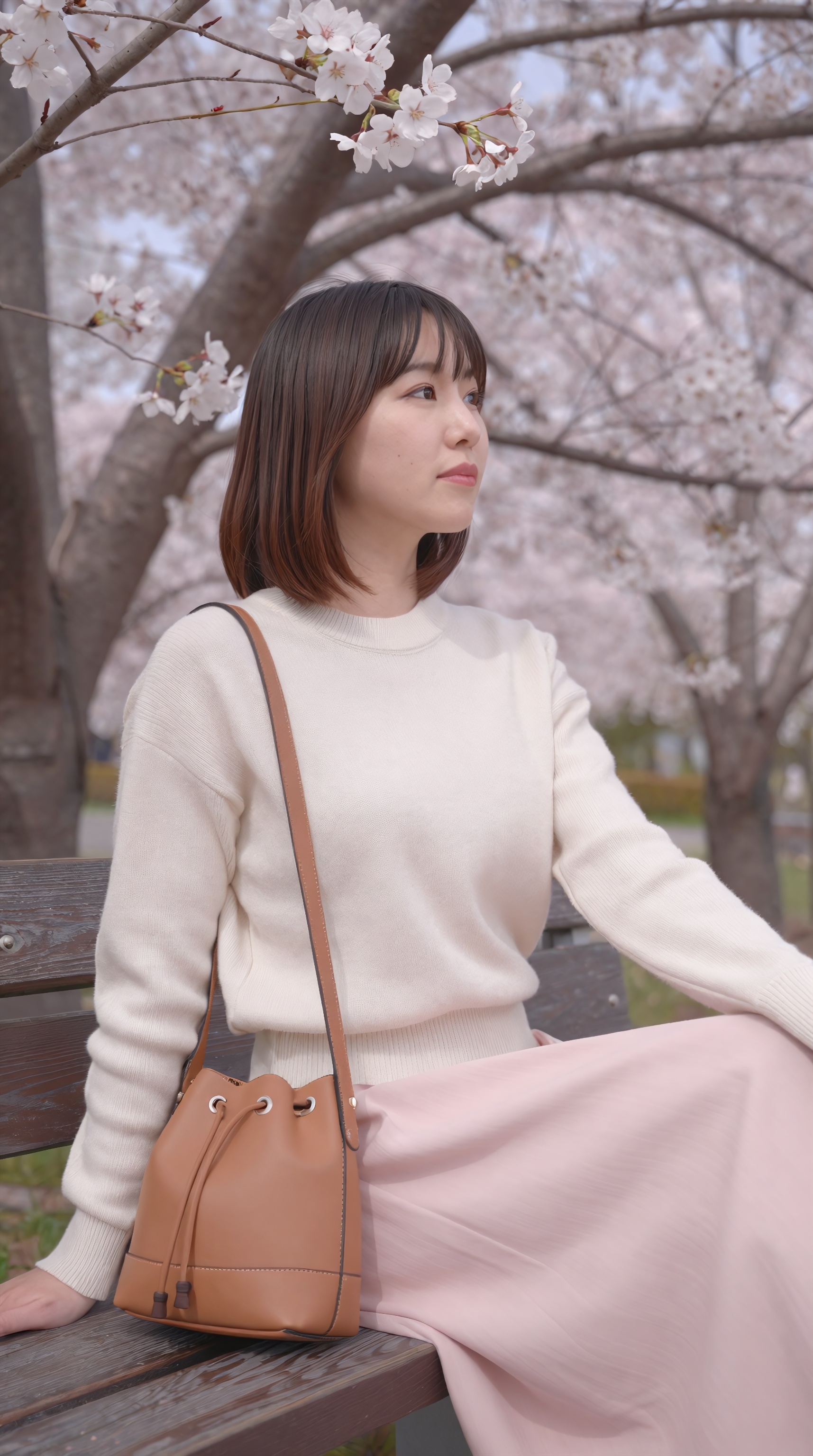 美しい日本人女性、満開の桜の木々に囲まれた、日当たりの良い公園の風化した木のベンチに若い日本人女性が優雅に座っています。彼女は、体にぴったりフィットする柔らかなクリーム色のリブ編みニット セーターを着ており、足の周りにエレガントにドレープする流れるような淡いピンクのスカートを合わせています。黄褐色の革のバケツバッグが肩からぶら下がっており、その巾着の留め具が前面に見えています。彼女の長くて暗い髪が。。高画質でフリーのNightStock素材です。商用利用可能・クレジット表記不要。
