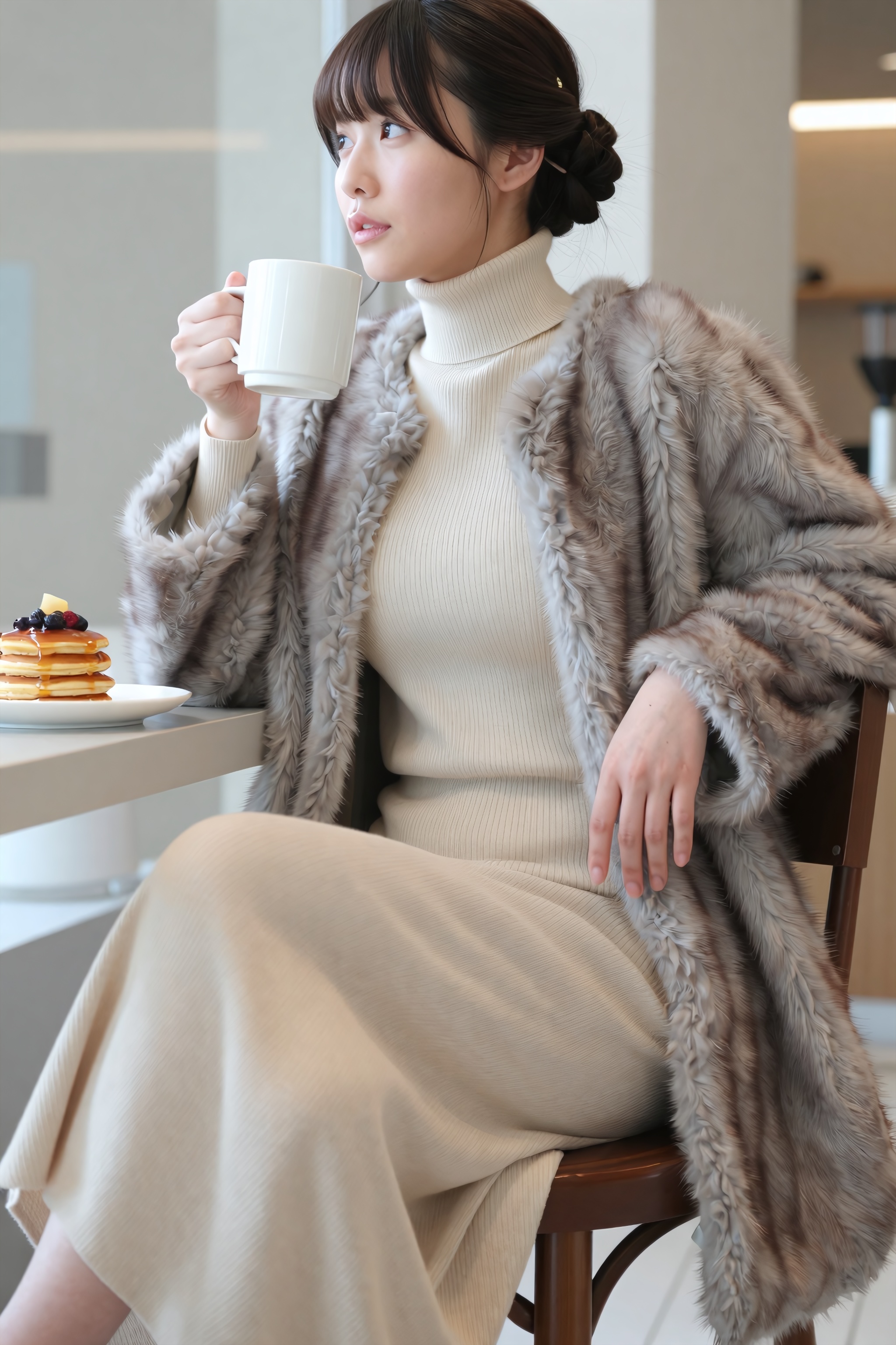 美しい日本人女性。若い日本人女性が、明るくモダンなカフェ内の木製の椅子に優雅に座り、右手に白い陶器のマグカップを持ち、シロップとフルーツがトッピングされた金色のパンケーキの皿の横のカウンターに左腕を置いています。彼女は、肩にそっとかかる豪華なライトグレーのフェイクファーコートを着ており、クリーム色のリブ編みのタートルネックセーターと、足首までエレガントに流れるお揃いのロングスカートを合わせています。。高画質でフリーのNightStock素材です。商用利用可能・クレジット表記不要。