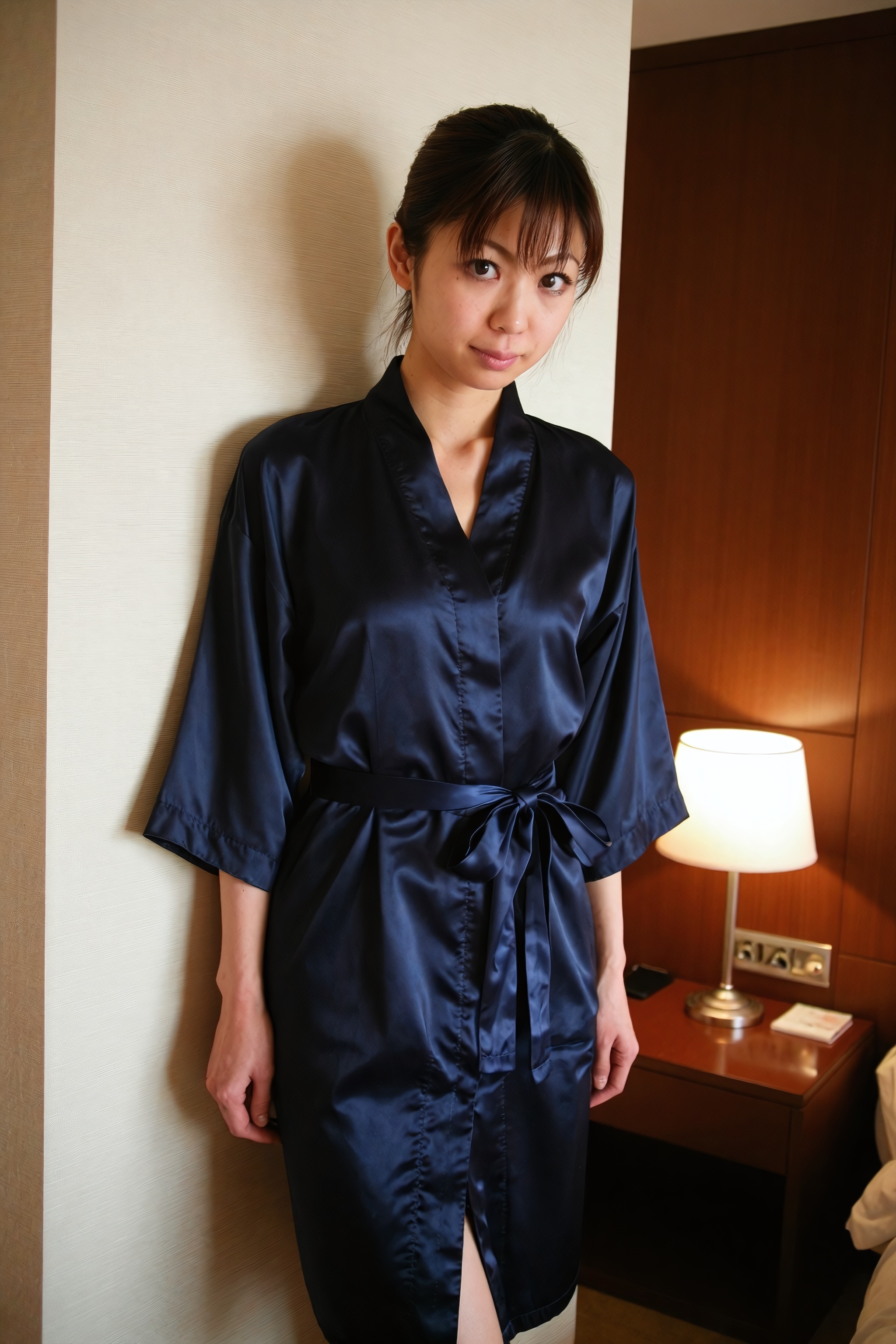 美しい日本人女性 柔らかな光が差し込むホテルの部屋に佇む若い日本人女性を、エレガントな存在感を際立たせる全身ショットで捉えました。彼女は、幅広の七分袖と V ネックの襟が付いた、深いネイビーブルーの長いシルクのローブを着ており、シンプルなリボンで結ばれたお揃いの生地のベルトでウエストを締めています。ローブは彼女のフレームに滑らかにドレープし、その光沢のある表面が周囲の光を捉え、縫い目や折り目に沿っ。。高画質でフリーのNightStock素材です。商用利用可能・クレジット表記不要。