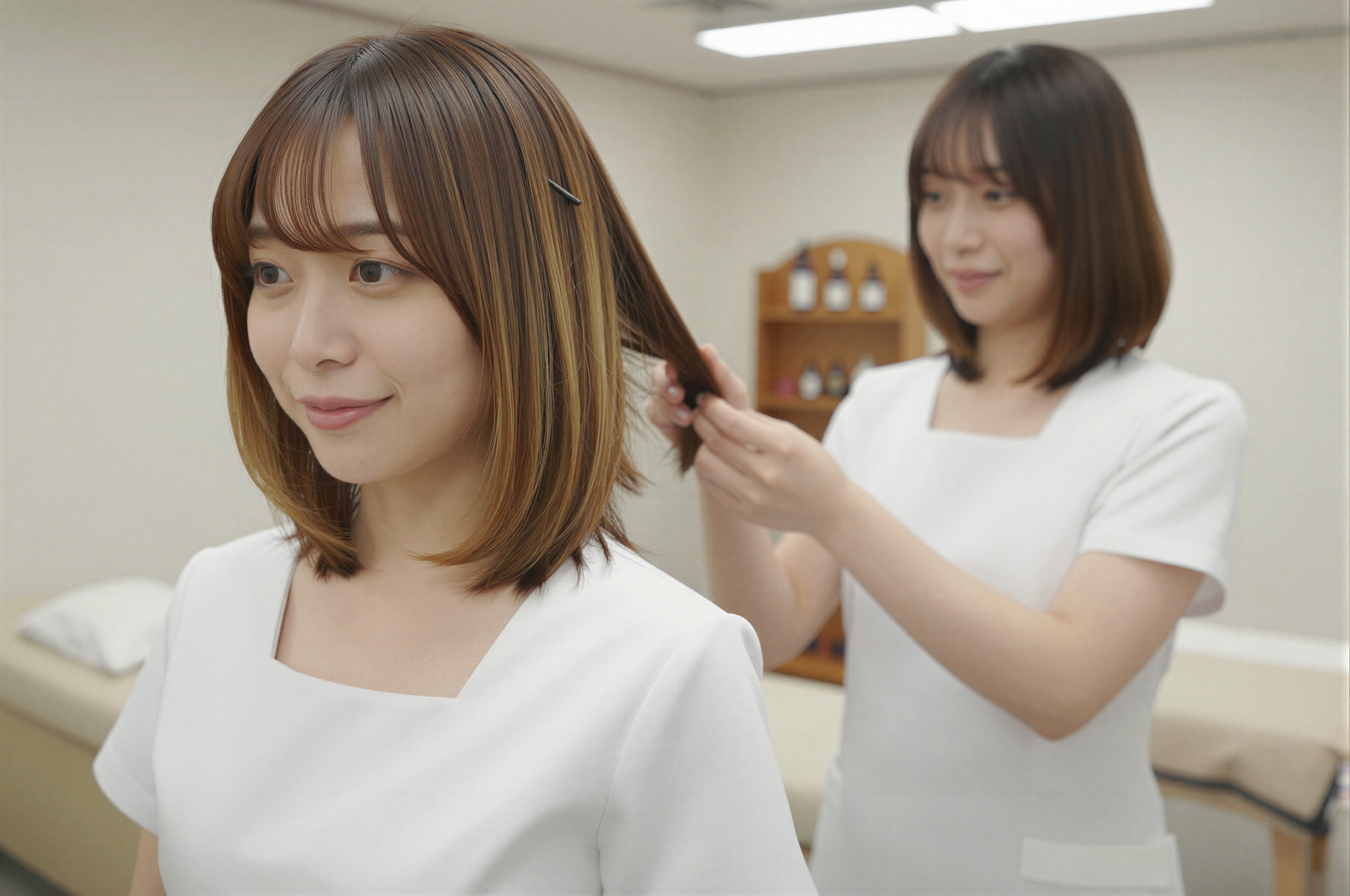 プロのエステティシャンを思わせる、ぴったりとしたフィット感のさわやかな白い半袖制服ドレスを着た日本人女性。彼女は壁に取り付けられた鏡で髪を整えており、自信に満ちた集中した視線が反射されています。シンプルなアパートメントの部屋には、明るい蛍光灯の頭上のライトの下に、ベージュのシーツで覆われたマッサージ ベッドが 1 台、白い枕があり、オイルボトルが入った小さな木の隅の棚が置かれています。彼女の落ち着。。高画質でフリーのNightStock素材です。商用利用可能・クレジット表記不要。