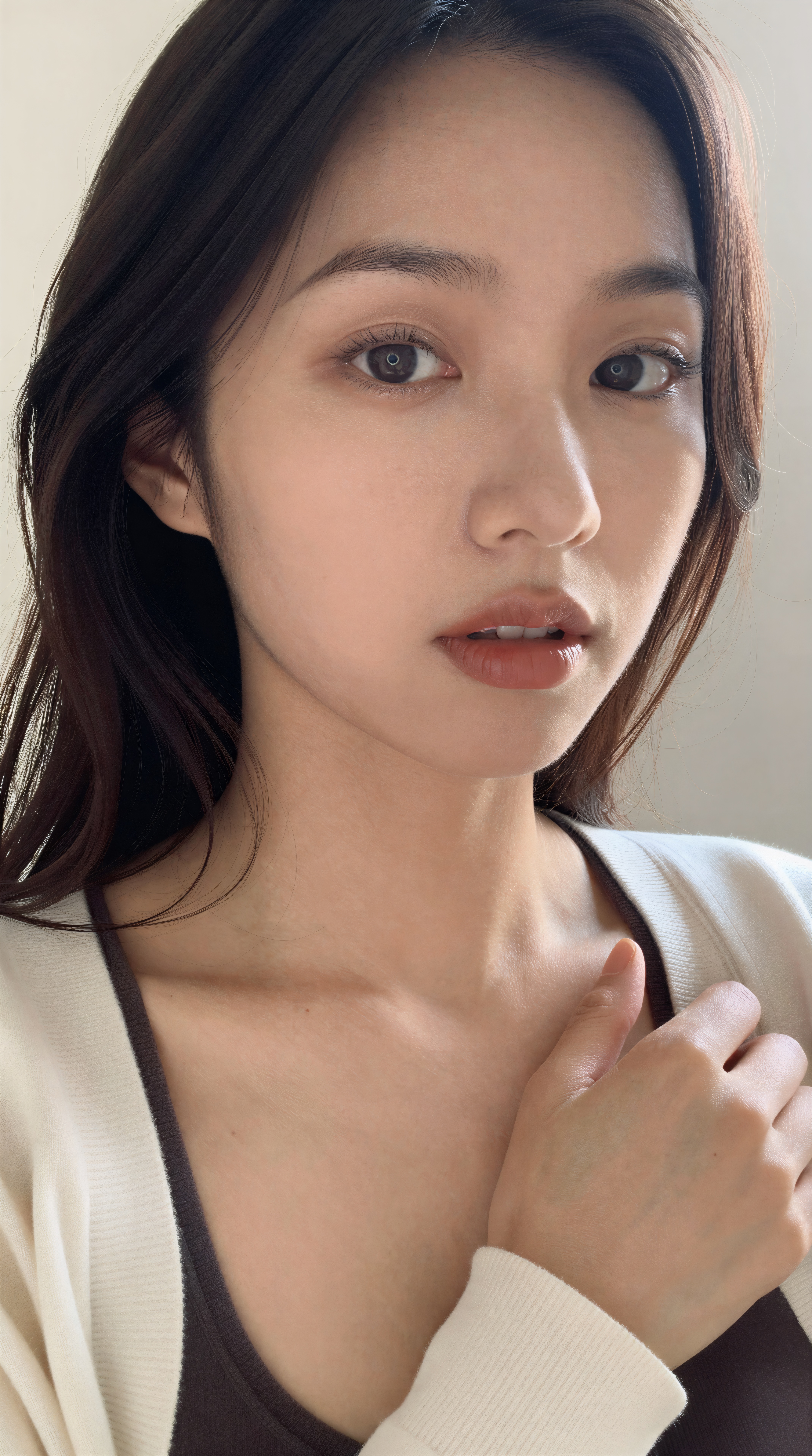 美しい日本人女性。この画像には、長いストレートの黒髪と前髪のある若い日本人女性が白い壁の前で自撮りをしています。彼女は胸に黒いストラップが付いた白い長袖シャツを着ており、ドレスかトップスの一部のように見えます。ストラップは細くて黒で、全体の外観にエレガントなタッチを加えています。女性の表情は無表情で、自撮り写真を撮るとき、唇を少しとがらせています。。高画質でフリーのNightStock素材です。商用利用可能・クレジット表記不要。