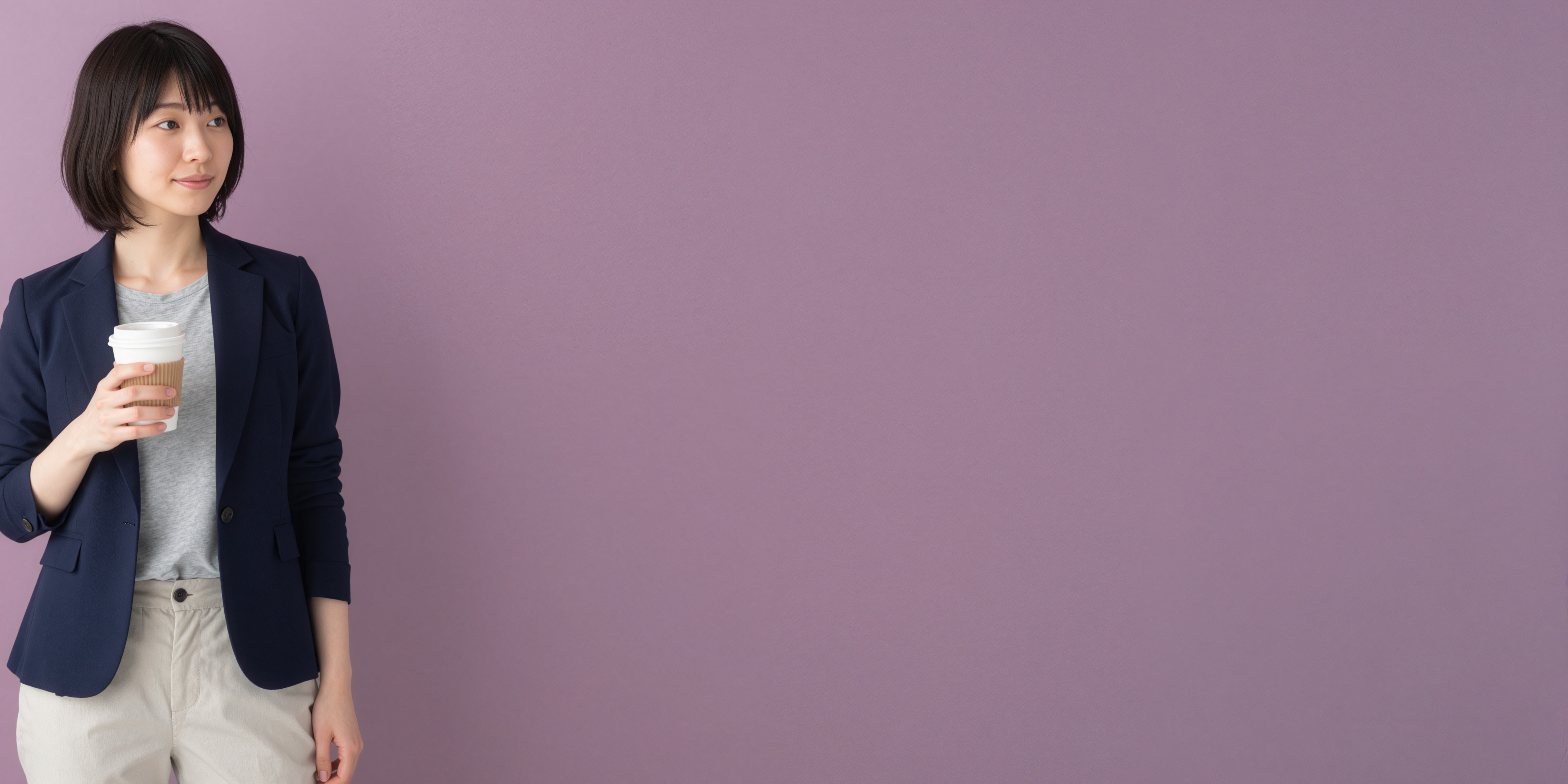 紺色のジャケットとベージュのパンツを着用し、コーヒーカップを手に持ち、横目で見ているビジネス女性のポートレート写真です。