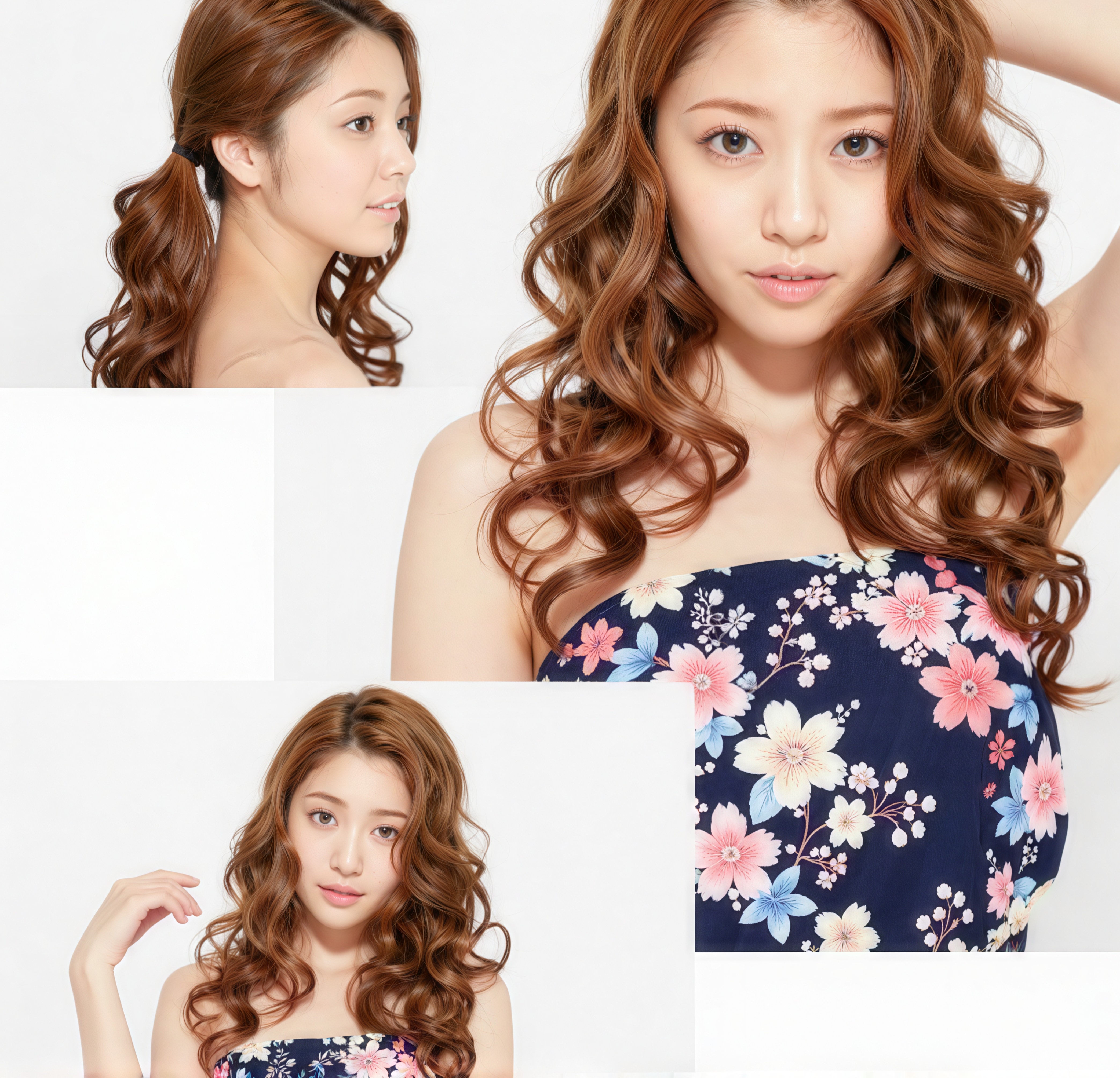 花柄のトップスを着た女性が、大きなウェーブヘアを飾り、自信に満ちた表情でカメラを見つめています。