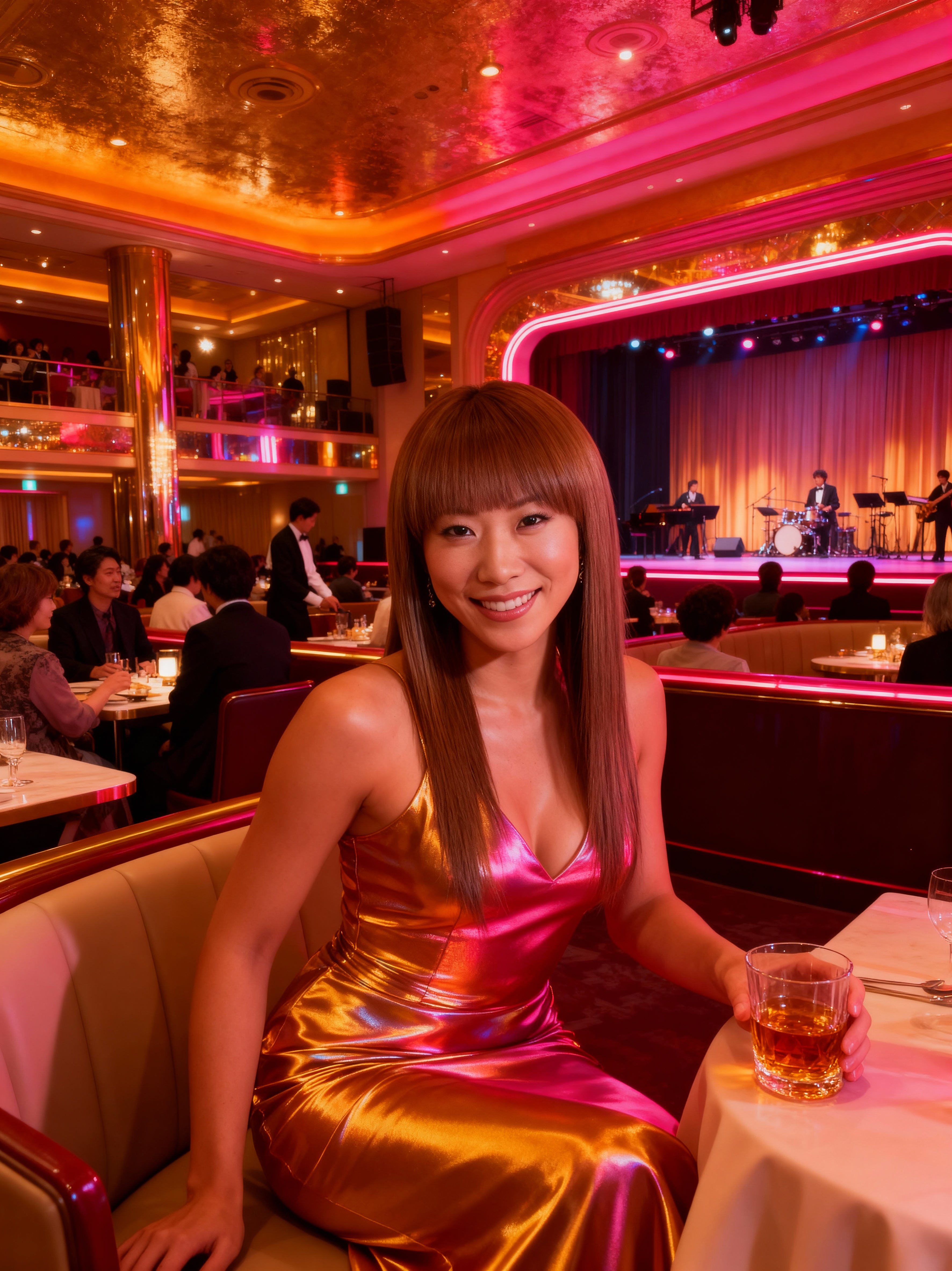 高級レストランの雰囲気の中で、ドリンクのグラスを持ちながら微笑む若い女性を正面から写実的に撮影したもの。この画像には、ステージとオーケストラを背景にした薄暗いレストランも示されています。画像の中央では、長い茶色の髪と前髪を持つ若いアジア人女性がブースに座っており、彼女のスリムな体と裸の肩を強調する光沢のある金色のサテンのドレスを着ています。彼女は自信に満ちた笑顔を浮かべ、カメラをまっすぐに見つめています。彼女の髪は、前髪が顔を縁取るストレートでストレートな外観にスタイリングされています。彼女の目もわずかに微笑みながら視聴者をまっすぐに見つめています。彼女はイヤリングをしており、肩はむき出しで、体はスリムです。彼女のドレスは深いVネックラインでノースリーブで、彼女の曲線を強調しています。彼女の表情は喜びと満足感に満ちており、口はわずかに開き、歯が見えています。彼女はブースの上に手を置き、右手にはウィスキーの入った小さなグラスを持っています。背景には、テーブルに座ってフォーマルなディナーを楽しむ大勢の人々が描かれており、彼女の後ろのステージではミュージシャンが楽器を演奏しています。レストランは温かみのある金色の色合いで、高い天井と華やかな装飾が施されており、照明は柔らかく温かみがあり、居心地の良い雰囲気を作り出しています。