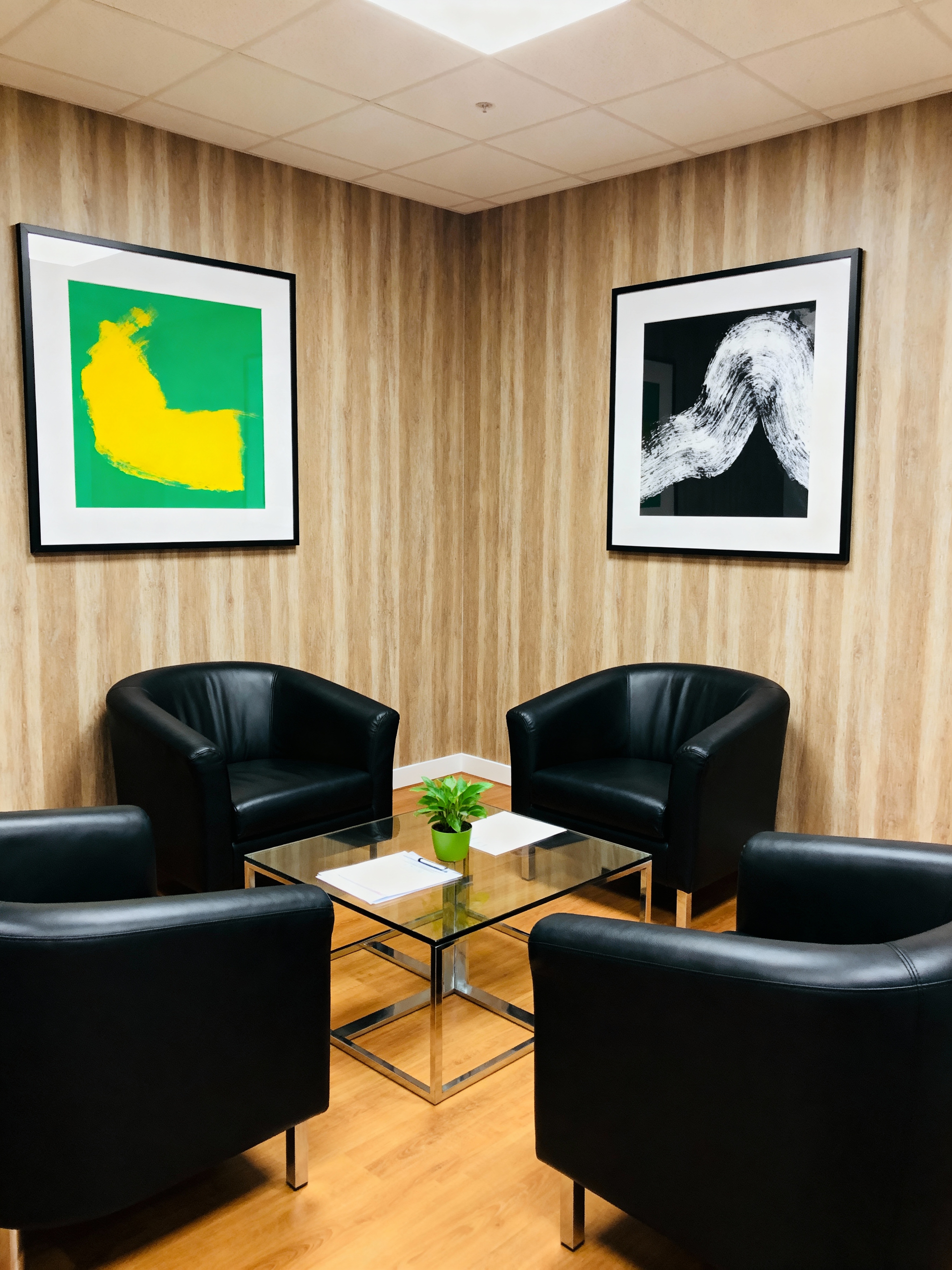 木製パネルと黒い革張りの椅子を備えたモダンなオフィス ロビー。画像の左側には、2 つの額入り作品が壁に掛けられています。1 つはカリフォルニア州の黄色い地図で、もう 1 つは白黒の抽象画です。右側、部屋の中央のガラスのコーヒーテーブルの上に小さな鉢植えがあります。椅子は黒の革張りで、洗練されたモダンなデザインです。部屋には埋め込み型の照明から自然光が差し込み、温かみのある居心地の良い雰囲気が漂います。壁は明るい色の木製パネルでできており、空間に居心地の良いプロフェッショナルな雰囲気を与えています。全体的な配色はニュートラルで、抽象的な絵画と椅子の洗練されたデザインに重点が置かれています。