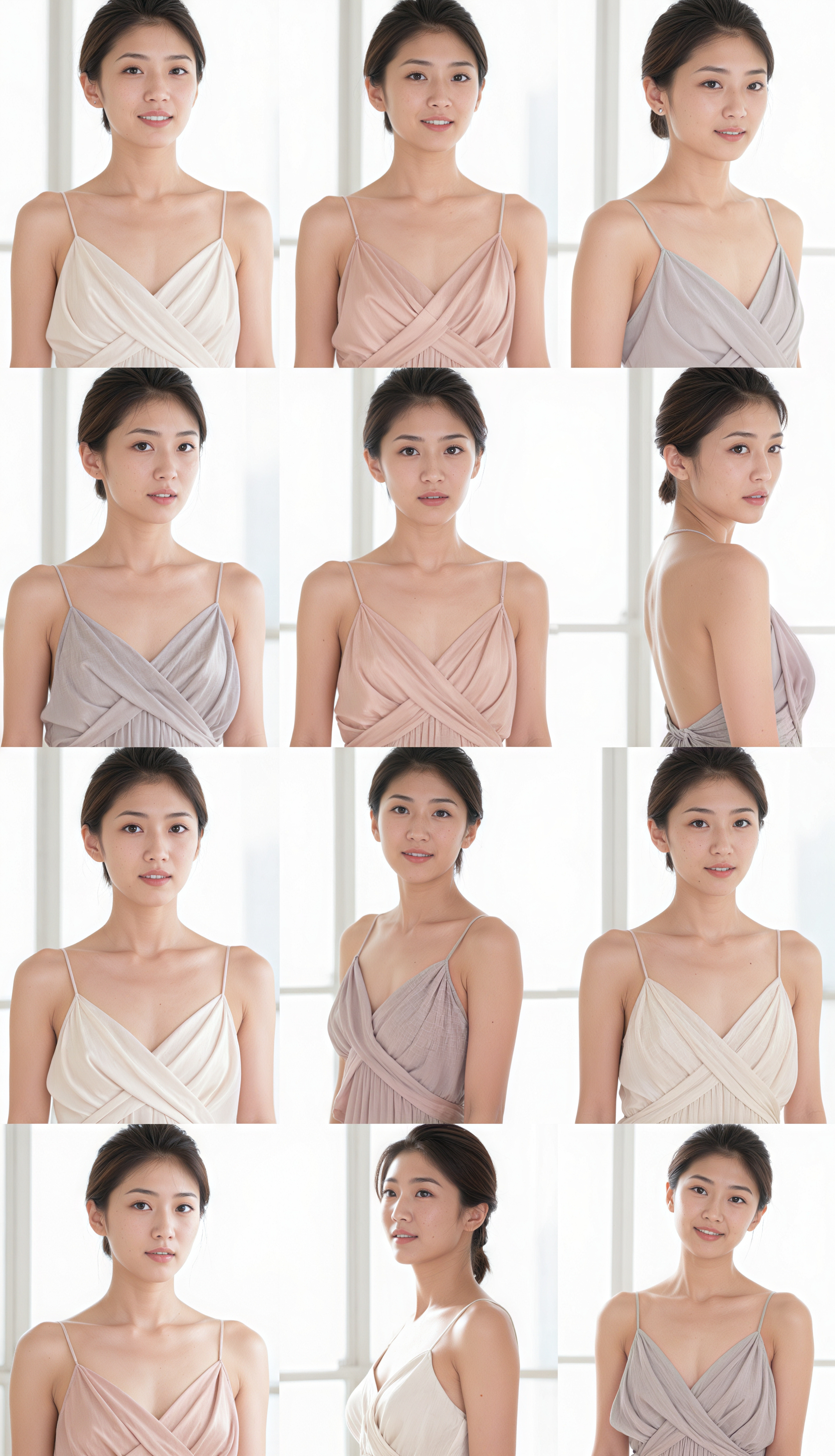 複数の写真が格子状に配置され、複数の行と列で表示された若い女性の写実的なポートレート。その女性はアジア系と思われ、中性的な表情とわずかな笑みを浮かべて、白いカーテンのある大きな窓の前に立っています。彼女の髪はダークブラウンのショートヘアでまとめられており、細いストラップが体に巻きついた淡いピンクのドレスを着ています。彼女の目は視聴者をまっすぐに見つめており、彼女の体は対称的な方法で配置されており、対称性と対称性の感覚を生み出しています。背景は大きな窓のある明るい白い部屋で、自然光が透過し、柔らかくぼやけた効果を生み出します。画像の全体的な美しさはモダンでミニマルで、窓からたくさんの自然光が差し込み、画像内で女性をさらに際立たせています。