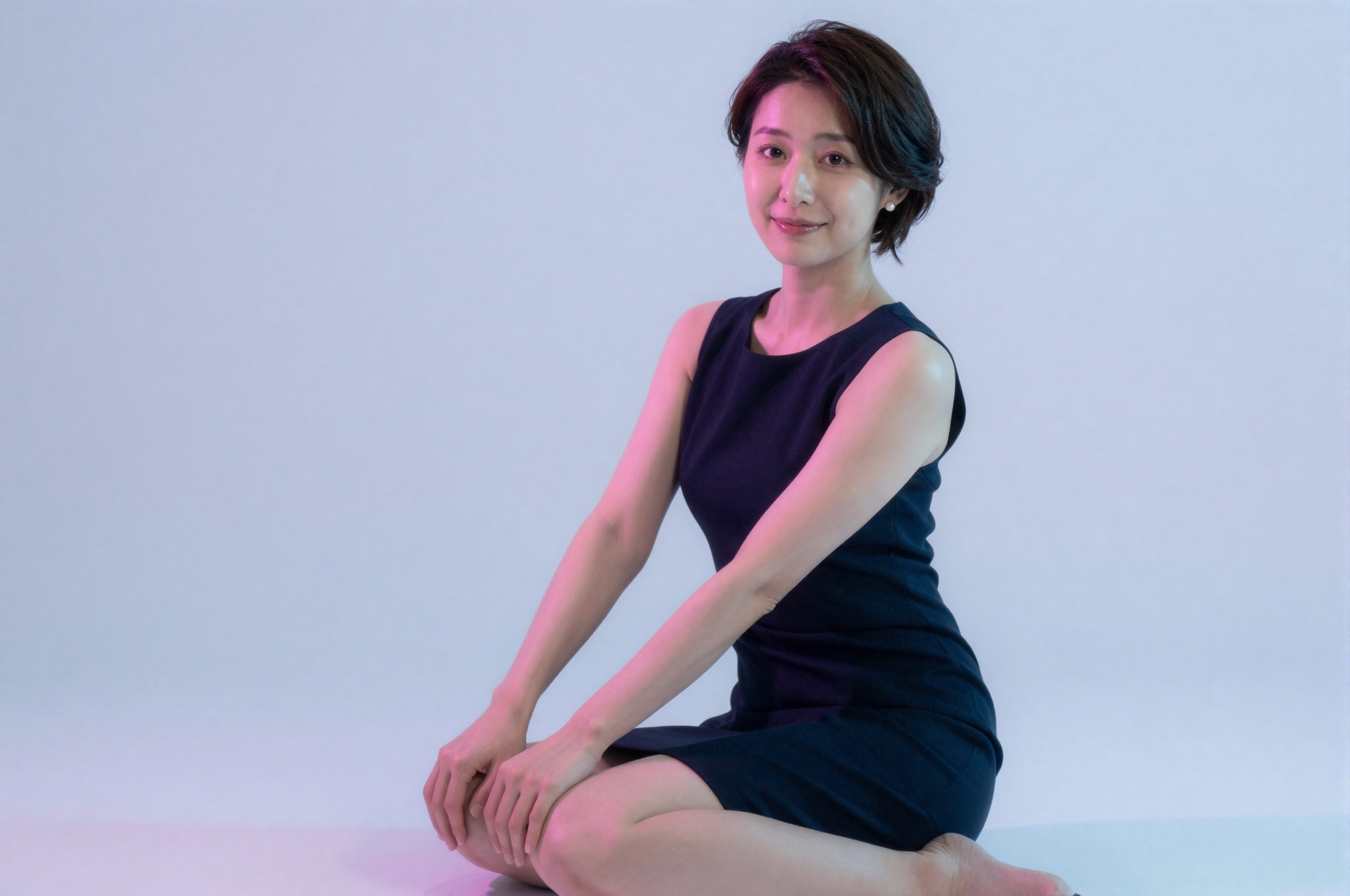 パールのアクセサリーが付いた上品なダークドレスを着た美しい日本女性、膝に手を当てあぐらをかいて座る人物像、洗練された優しい表情。清潔感のある純白の背景に上品な装飾を最小限に抑えた、高級感のあるリクルート写真に相応しい洗練された雰囲気を醸し出す設定で、文字、文字、数字、書き込み、透かしは一切使用しておりません。。高画質でフリーのNightStock素材です。商用利用可能・クレジット表記不要。
