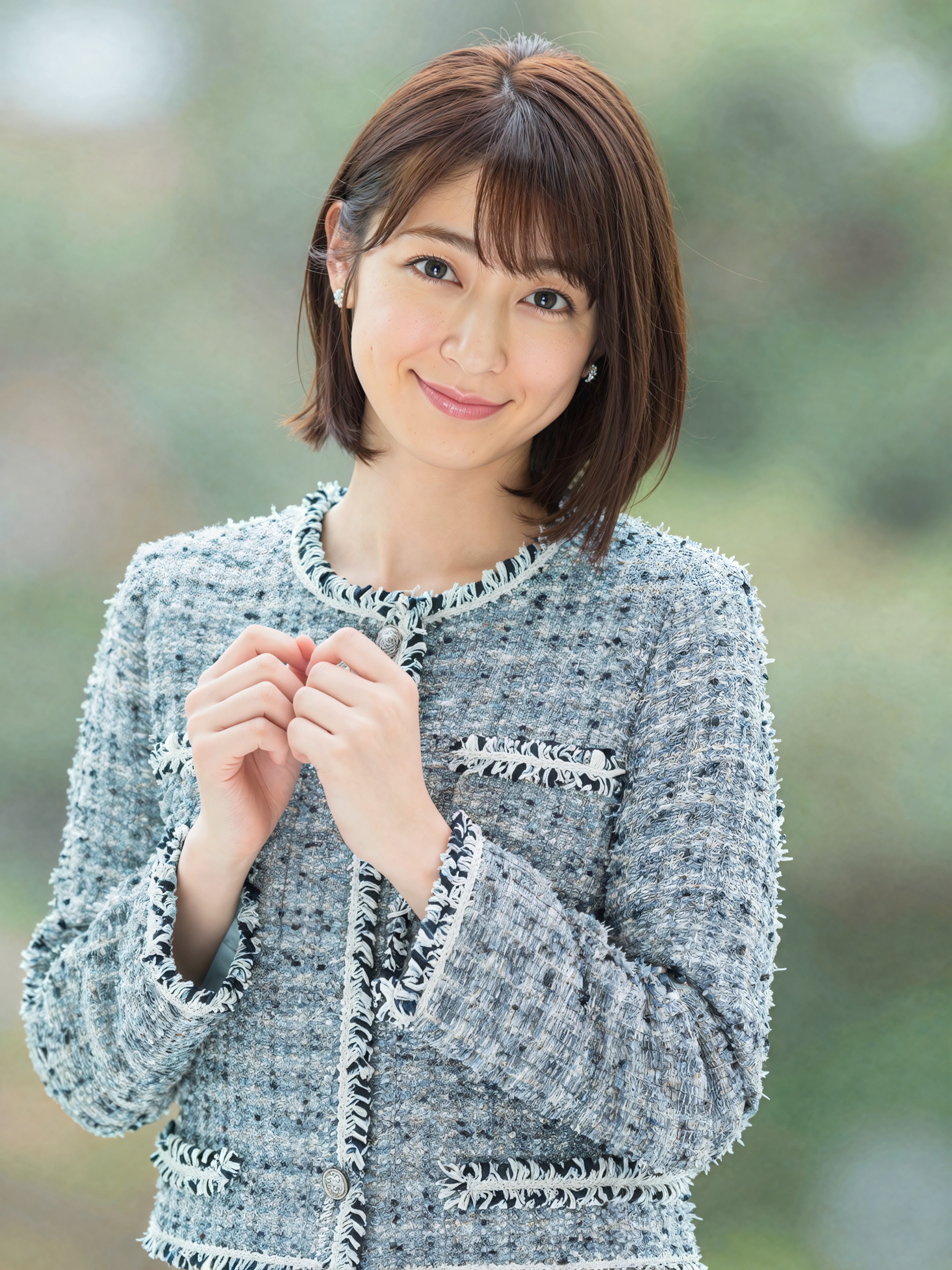 青い粗毛風のジャケットを着た短髪の女性が、手を前に合わせて微笑んでいる写真。背景はぼかされた緑色の自然風景。
