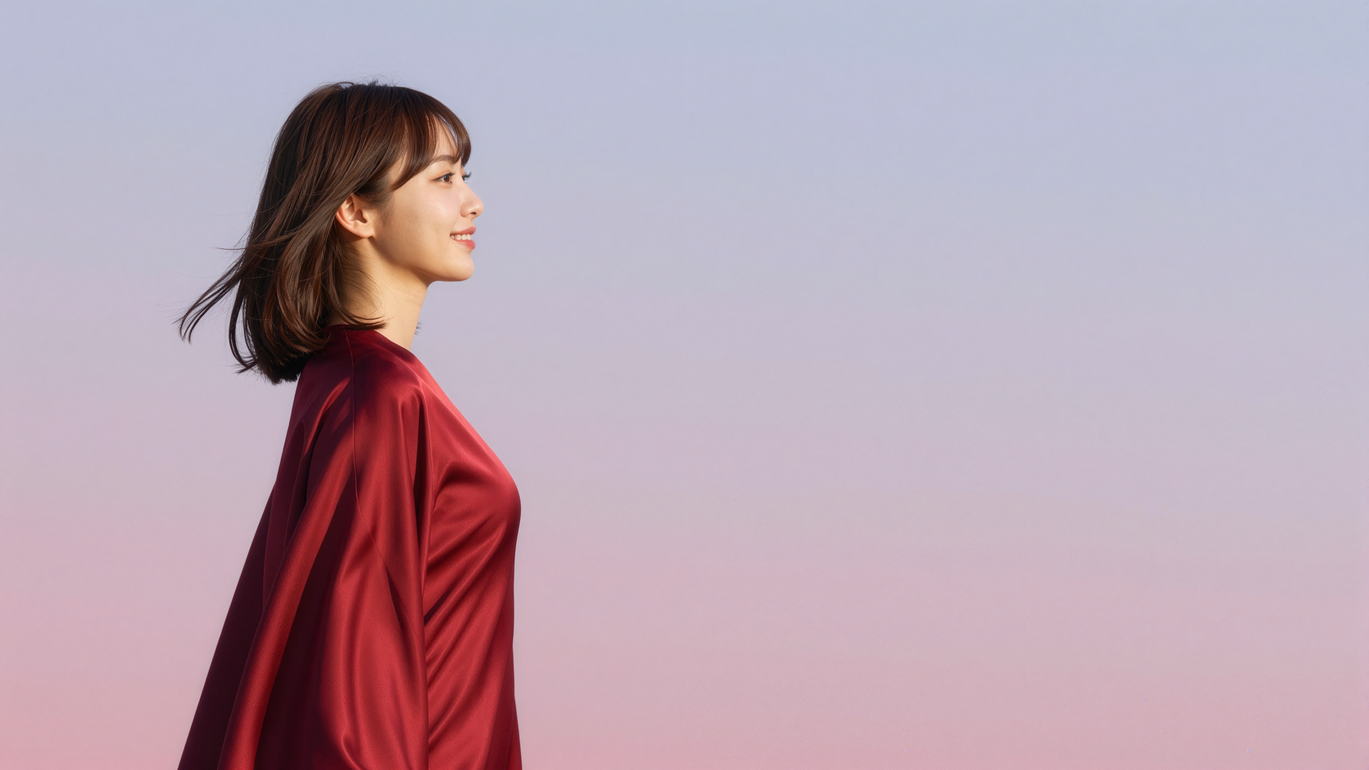 夕焼けのグラデーション背景に、赤いシルクのようなドレスを着た女性が横顔で微笑み、穏やかな雰囲気を放っています。