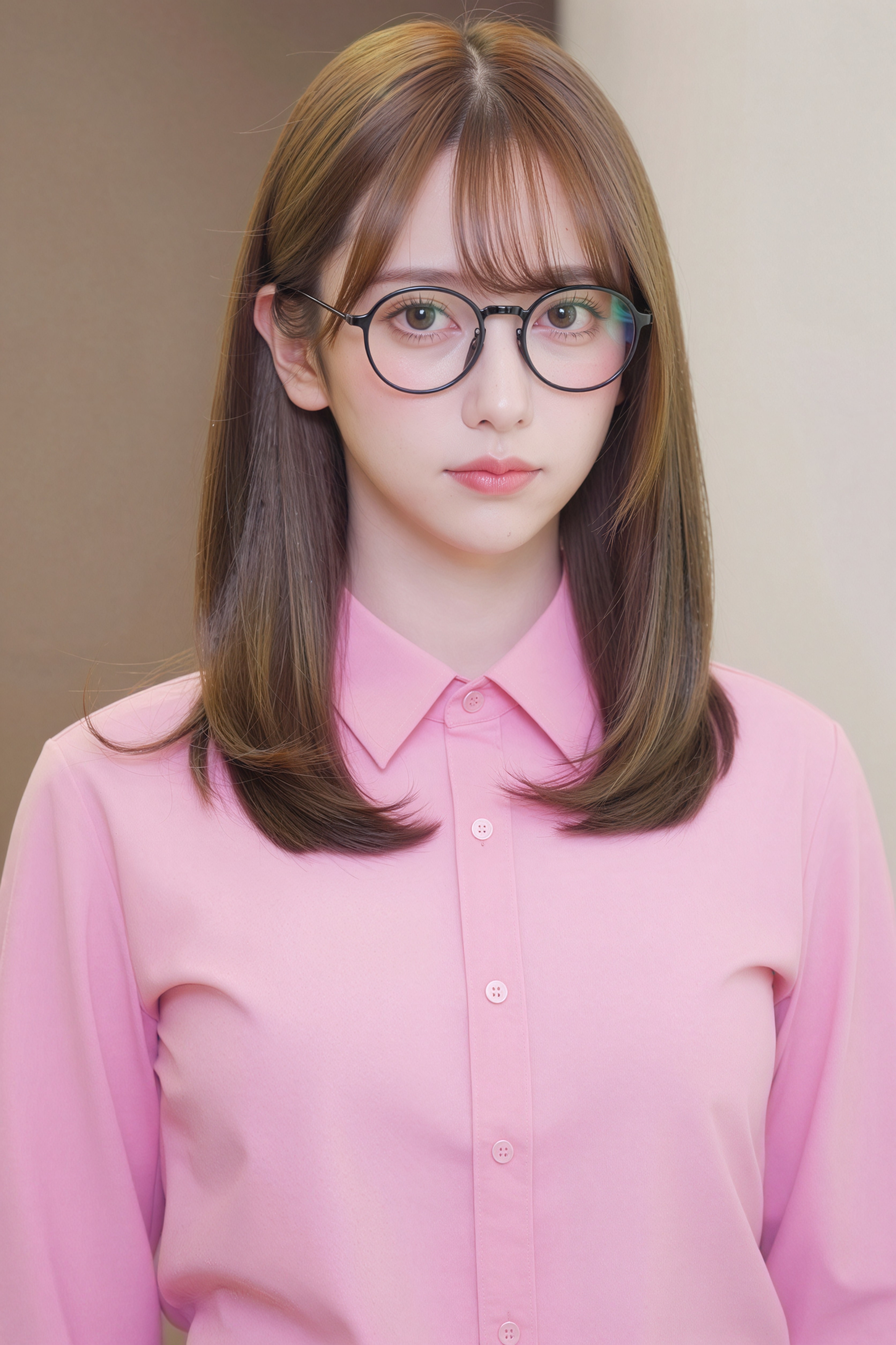 ピンク色のシャツを着て、黒い眼鏡をかけた女性がカメラを見つめている静かなポートレート写真です。