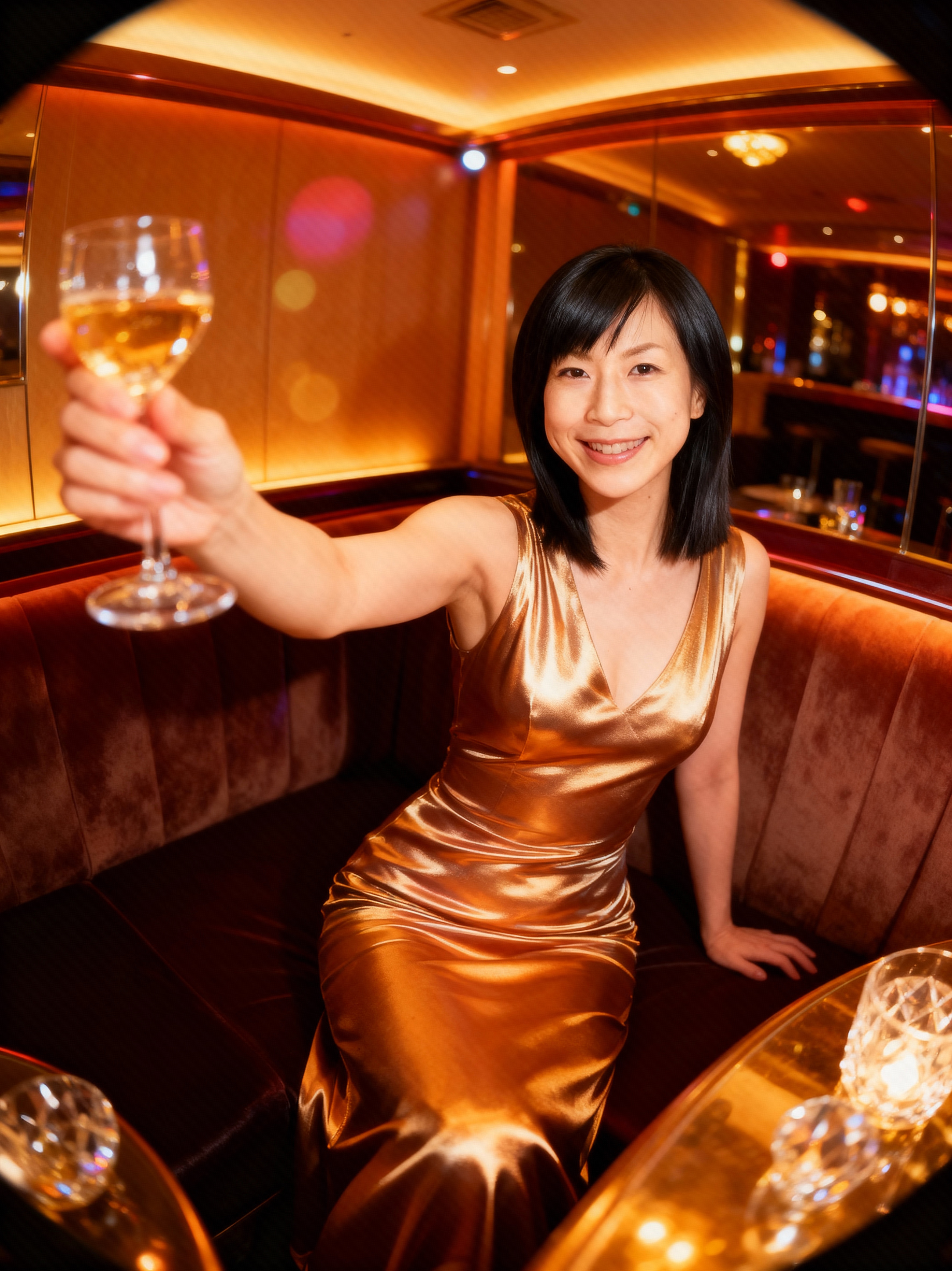 高級レストランで白ワインを飲みながらセルフィーを撮る女性を円形の視点から写実的に撮影した作品。この画像には、ボケ味のライトとバーが背景にある薄暗い室内も示されています。画像の中央では、光沢のあるゴールドのサテンのドレスを着た短い黒髪の女性がベルベットのブースに座っています。彼女は微笑んで右手にグラスを持ち、左手はブースの上に置いています。女性は20代半ばに見え、肌は白く、体はスリムです。髪はショートボブカットで、メイクは最小限に抑えています。彼女の目はわずかに微笑みながらカメラをまっすぐに見ています。