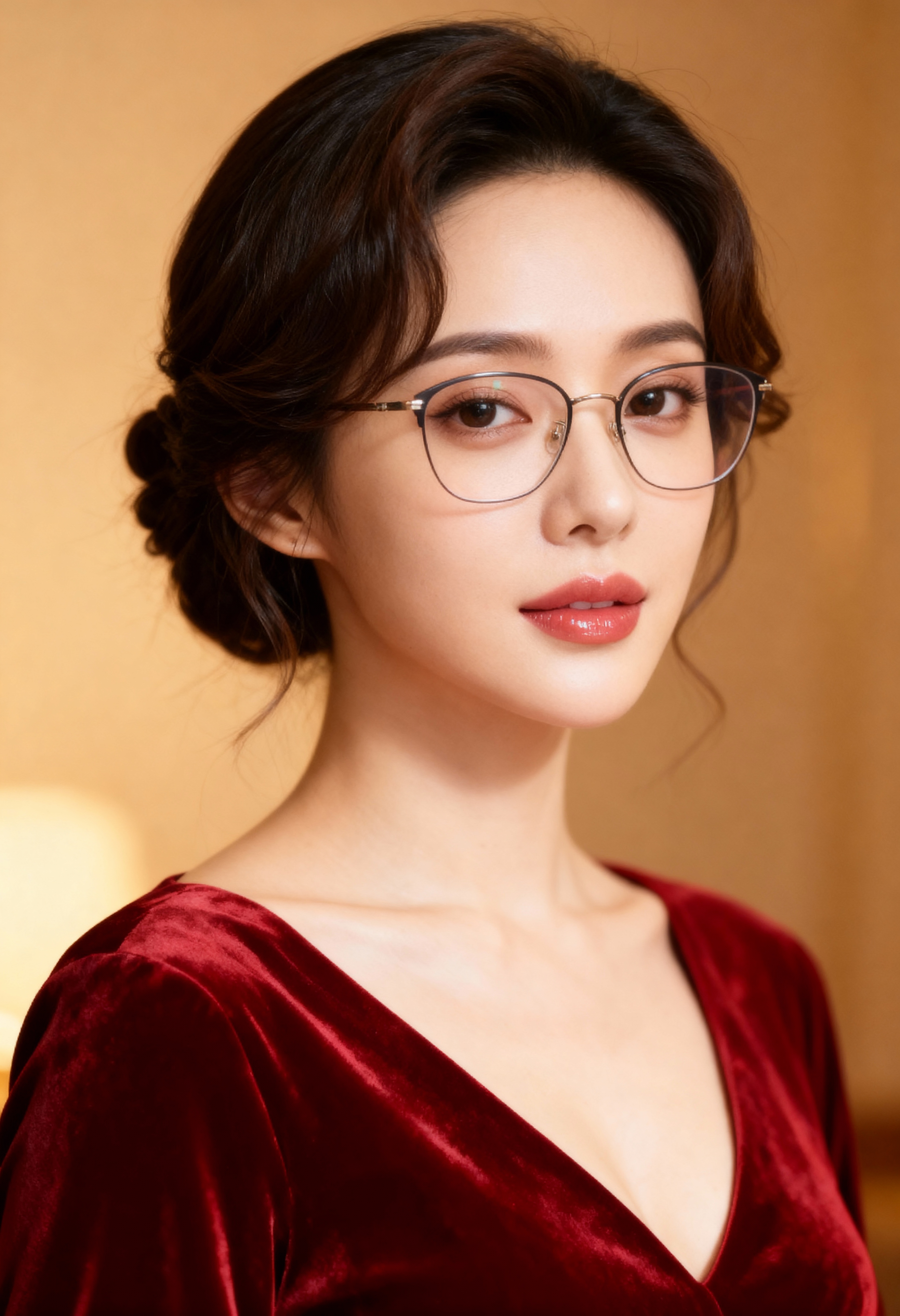 メガネと赤いベルベットのドレスを着た若い女性のポートレートをポートレート アングルから撮影した写実的なポートレート。画像には、彼女の顔と上半身を照らす柔らかくて暖かい光も示されています。画像の中央では、白い肌とダークブラウンの髪を一つにまとめた20歳の女性が、中性的な表情でカメラをまっすぐに見つめているように見えます。彼女は茶色の目をしており、丸い銀フレームの眼鏡をかけています。女性は深いVネックのバーガンディのベルベットのドレスを着ており、スリムな体型と繊細な顔立ちを強調しています。彼女の髪は一つの三つ編みを使ったエレガントなアップヘアにスタイリングされており、彼女の洗練された外観をさらに高めています。彼女の唇にはほのかに赤い口紅が塗られており、最小限の化粧をしています。背景はぼかされており、温かみのある金色の色合いが女性の顔立ちに微妙なコントラストを与えています。