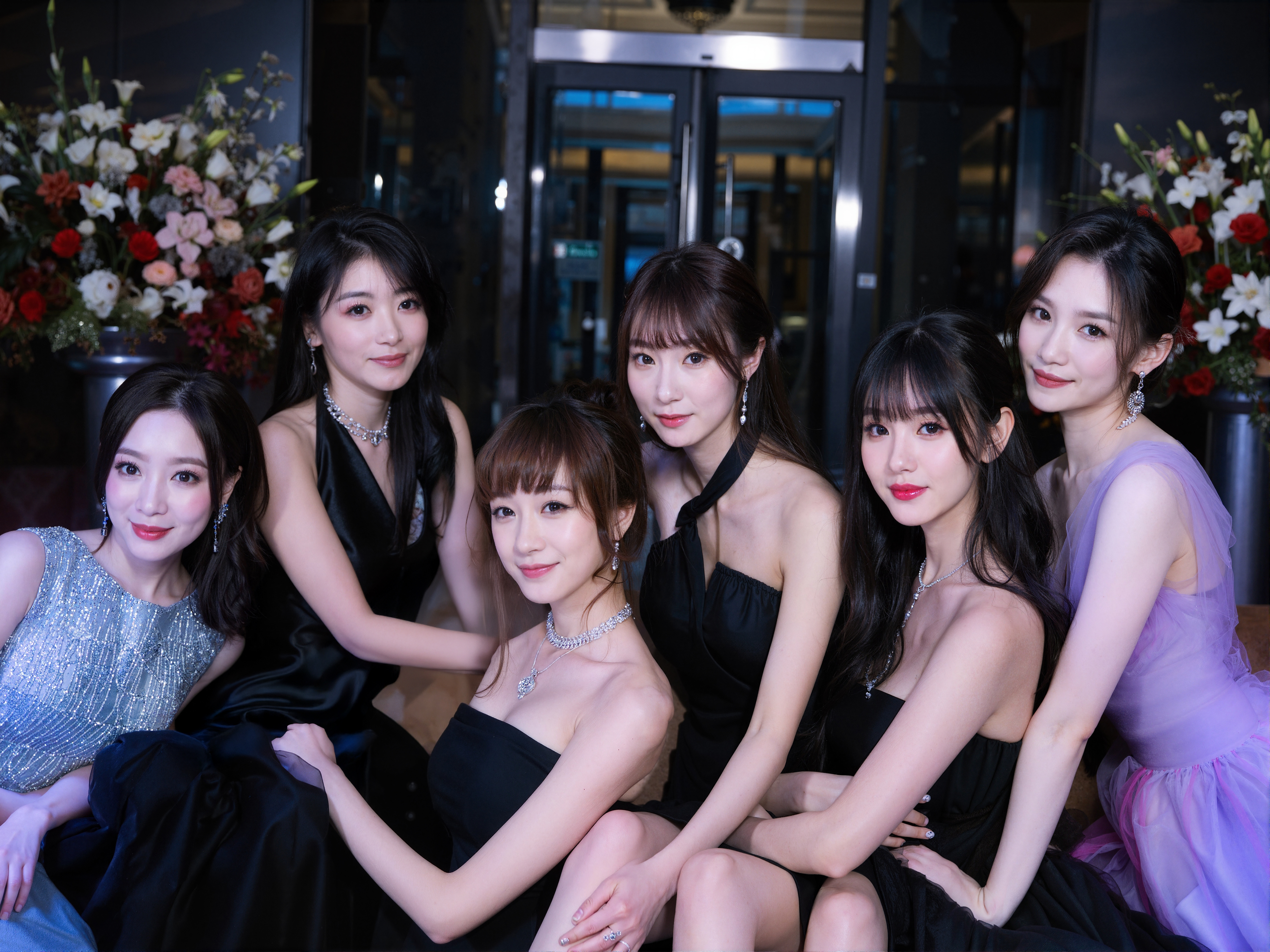 花で飾られた豪華なロビーの前で写真を撮る 7 人の若い女性のグループ。女性たちは正装を着ており、左側の女性は銀色のスパンコールのトップと黒いガウンを着ており、中央の女性はネックラインが大きく開いた黒いストラップレスのガウンを着ており、その隣の女性は紫色のチュールドレスを着ている。彼らは皆笑顔でカメラをまっすぐに見つめ、お互いの肩に腕を回し、一体感と調和の感覚を生み出しています。背景には大きなガラス扉と赤と白の花の花束が両側にあるモダンな建物が描かれており、画像の洗練されたエレガントな雰囲気を高めています。
