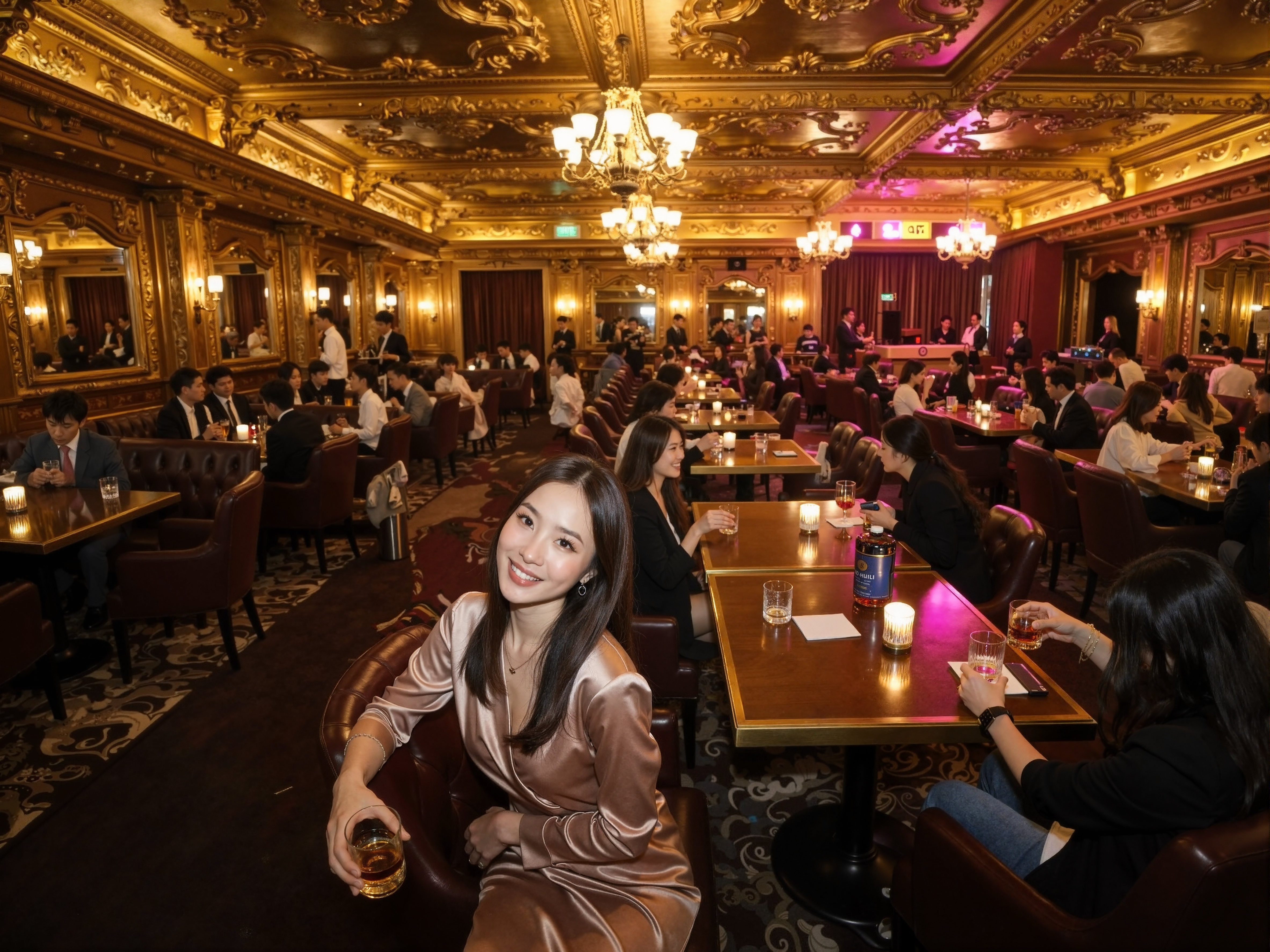 華やかな金枠の天井とシャンデリアのある豪華なレストランを正面から写実的に撮影したもので、部屋の中央のテーブルに座っている大勢の人々が写っています。部屋は、フォーマルな服装をしたさまざまな年齢、性別、民族の人々でいっぱいです。画像の主な焦点は、前景に座ってカメラに向かって微笑んでいる長い茶色の髪の若い女性です。彼女は茶色のサテンのローブを着て、手にビールのグラスを持っています。女性は10代後半か20代前半に見え、顔にはリラックスした自信に満ちた表情を浮かべています。彼女の髪はゆるいウェーブにスタイリングされ、背中に流れています。彼女の目は視聴者をまっすぐに見つめており、口元にはわずかな笑みが浮かんでいます。レストランには温かみのある居心地の良い雰囲気があり、ゲストが座ってドリンクを楽しめるようにテーブルと椅子が設置されています。壁は複雑な彫刻と華やかな鏡で飾られ、天井は豪華な金のアクセントで装飾されています。レストラン全体の雰囲気は洗練されており、エレガントな雰囲気があり、フォーマルな集まりに最適な場所です。
