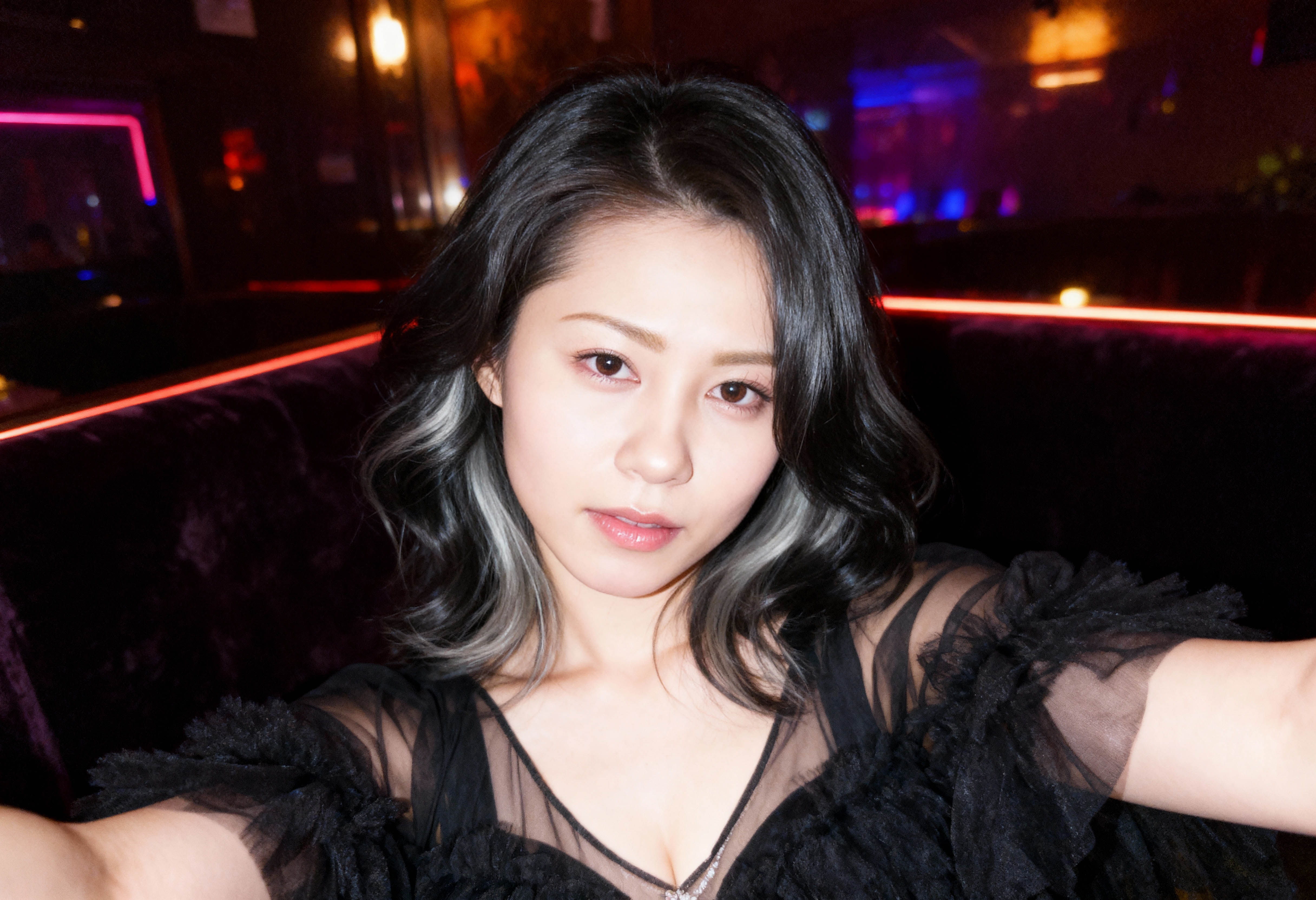 ネオンライトを背景に薄暗いナイトクラブで自撮りをする若い女性のポートレート。 10代後半から20代前半と思われる女性は画像の中央に位置し、上半身がカメラに向かい、中立的な表情で視聴者をまっすぐに見つめています。彼女はグレーのハイライトが付いたウェーブのかかった長い黒髪をしており、胸の谷間が見えるように大きく開いたネックラインの薄手の黒いドレスを着ています。彼女の茶色の目はカメラをまっすぐに見つめており、口元にはわずかな笑みが浮かんでいます。画像内の照明はドラマチックで、赤と青のネオンが背景を照らし、ムーディーな雰囲気を作り出しています。