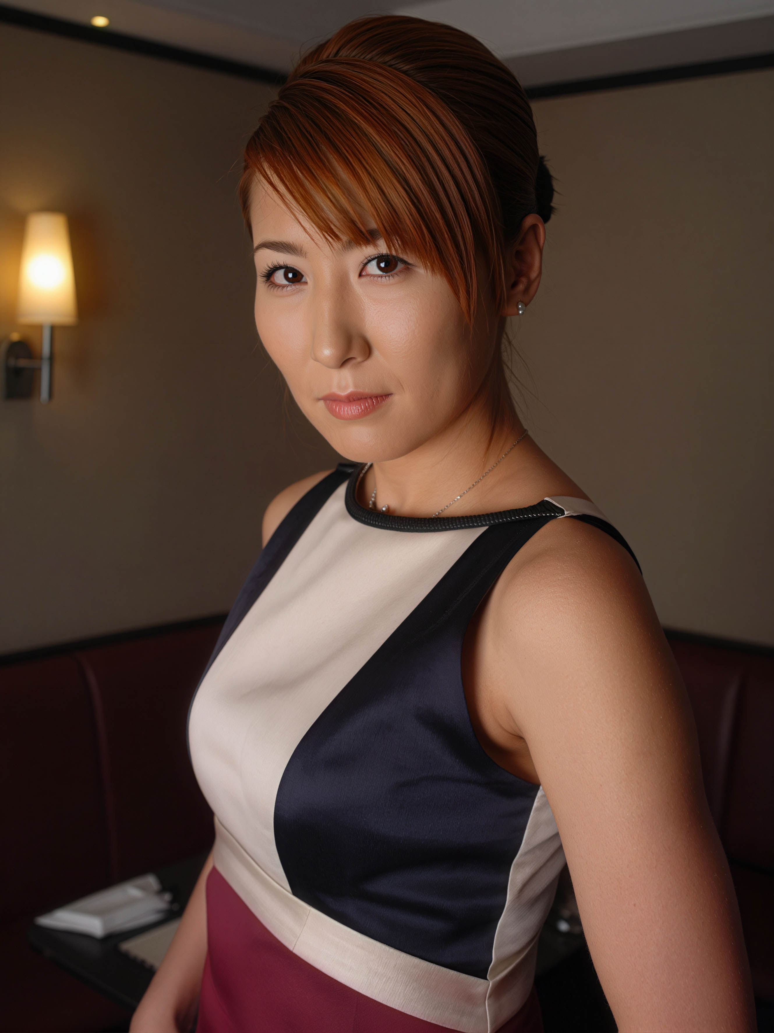 白い肌と高い位置でポニーテールに整えられた茶色の髪を持ち、ノースリーブのネイビーと白のカラーブロックのドレスと栗色のスカートを着た若いアジア人女性の写実的なポートレート。彼女は画像の中央に位置し、中立的な表情でカメラを直接見つめています。女性は10代後半か20代前半のように見え、髪を後ろでまとめてきちんとまとめており、茶色の目はまっすぐに視聴者を見つめています。彼女は顔にわずかな笑みを浮かべており、首には銀のネックレスをしています。背景は薄暗い部屋で、壁取り付け用燭台とワインレッドのブースがあり、居心地の良い雰囲気を作り出しています。照明は柔らかく温かみがあり、女性の顔に温かい光を当て、彼女の特徴を強調しています。画像はわずかに高い角度から撮影され、被写体の顔に奥行きと遠近感を与えます。全体的な雰囲気はプロフェッショナルで洗練されており、プロのポートレートを完璧に表現しています。