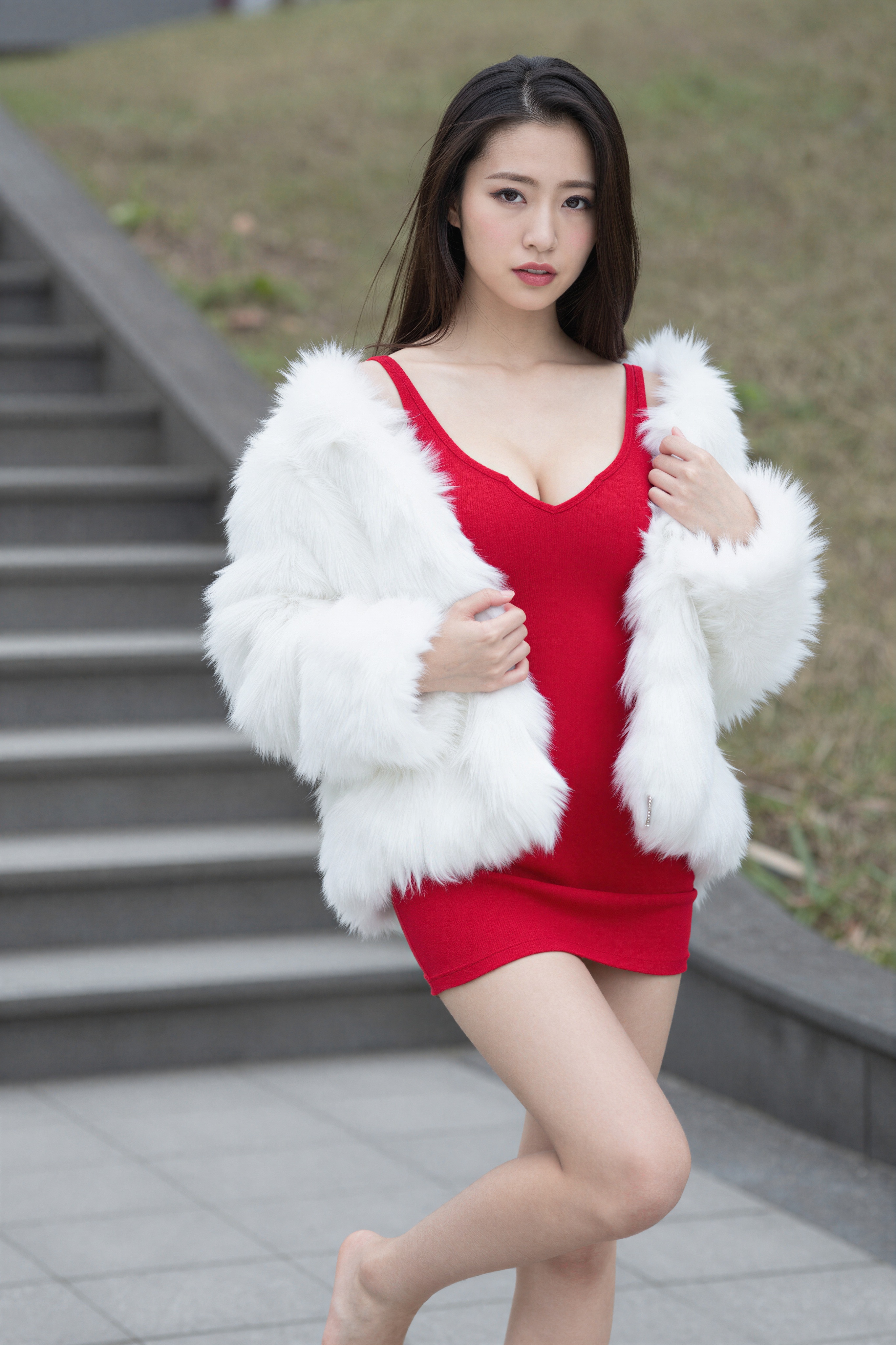 草の茂った丘に続く石段の横の舗装された道に屋外に立つ若者の全身ポートレート。彼女は柔らかいアジア人の顔立ちをしており、ふわふわの白いフェイクファーコートの下に真っ赤なミニドレスを着ており、胸の近くで両手を閉じています。彼女のポーズはエレガントでわずかに回転しており、ステップの途中であるかのように片足を膝で曲げたり、優雅にバランスをとったりしています。。高画質でフリーのNightStock素材です。商用利用可能・クレジット表記不要。