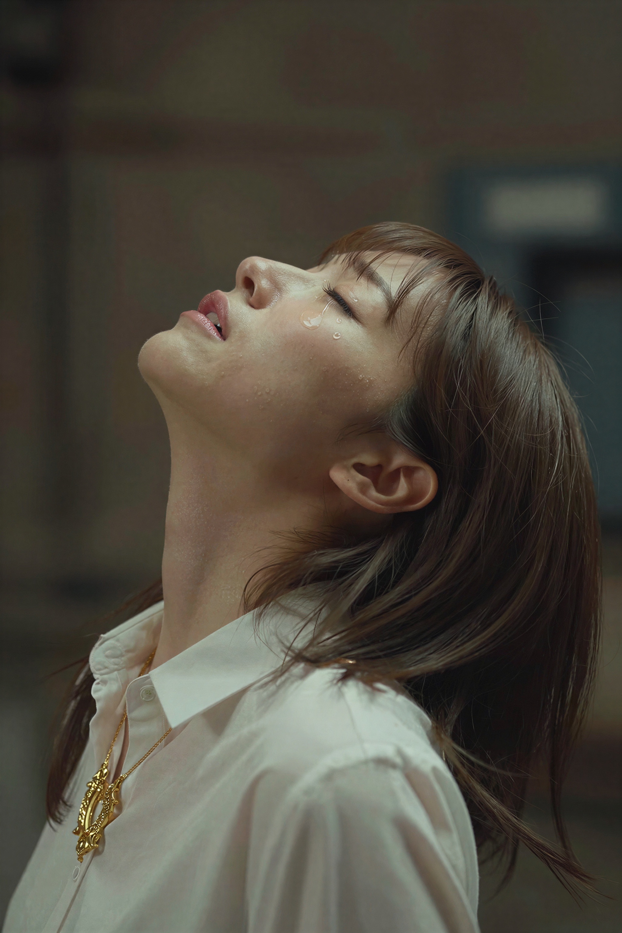 美しい日本人女性。若い日本人女性の横顔がクローズアップで捉えられており、頭を後ろに傾けて目を閉じて泣いているように見え、一筋の涙が頬を伝っているのが目に見えます。彼女は、骨格にゆったりとフィットするパリッとした白い襟付きシャツを着ており、鎖骨にかかる複雑なディテールを特徴とする華やかなゴールドのネックレスで飾られています。黒髪をすっきりとしたボブにまとめ、顔を柔らかく縁取っています。。高画質でフリーのNightStock素材です。商用利用可能・クレジット表記不要。