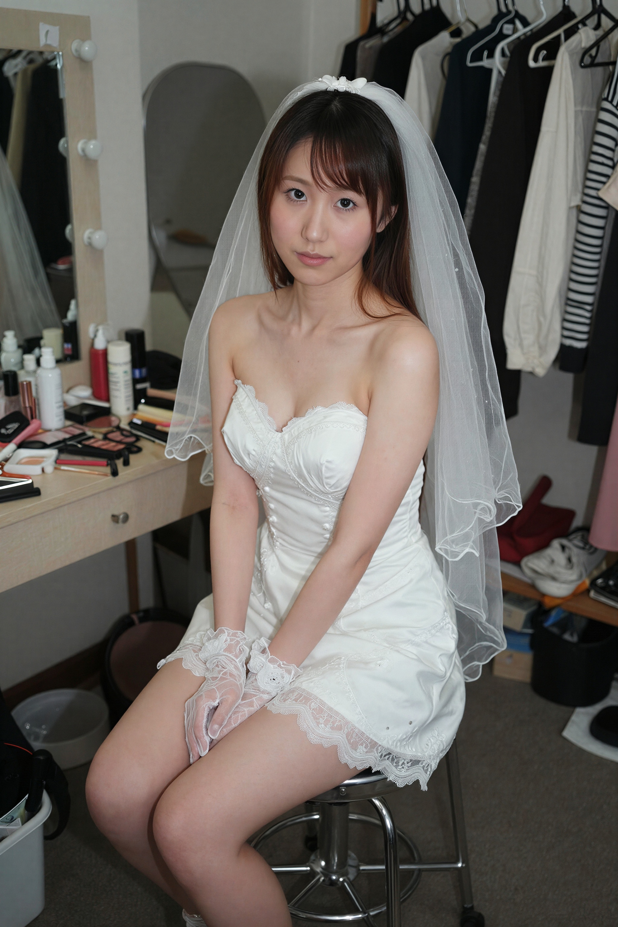 美しい日本人女性 若い日本人女性が、舞台裏の楽屋か寝室に似た薄暗く雑然とした部屋の金属製のスツールに座っており、周囲には洋服が掛けられ、化粧品やボトルが積まれた化粧台が置かれている。彼女は、裾と身頃に沿ってレースのディテールが施されたストラップレスの短い白いウェディングドレスを着ており、頭と肩に掛けられた白いベールと、手を覆う白いレースの手袋が組み合わされています。彼女のポーズは、リラックスしてい。。高画質でフリーのNightStock素材です。商用利用可能・クレジット表記不要。