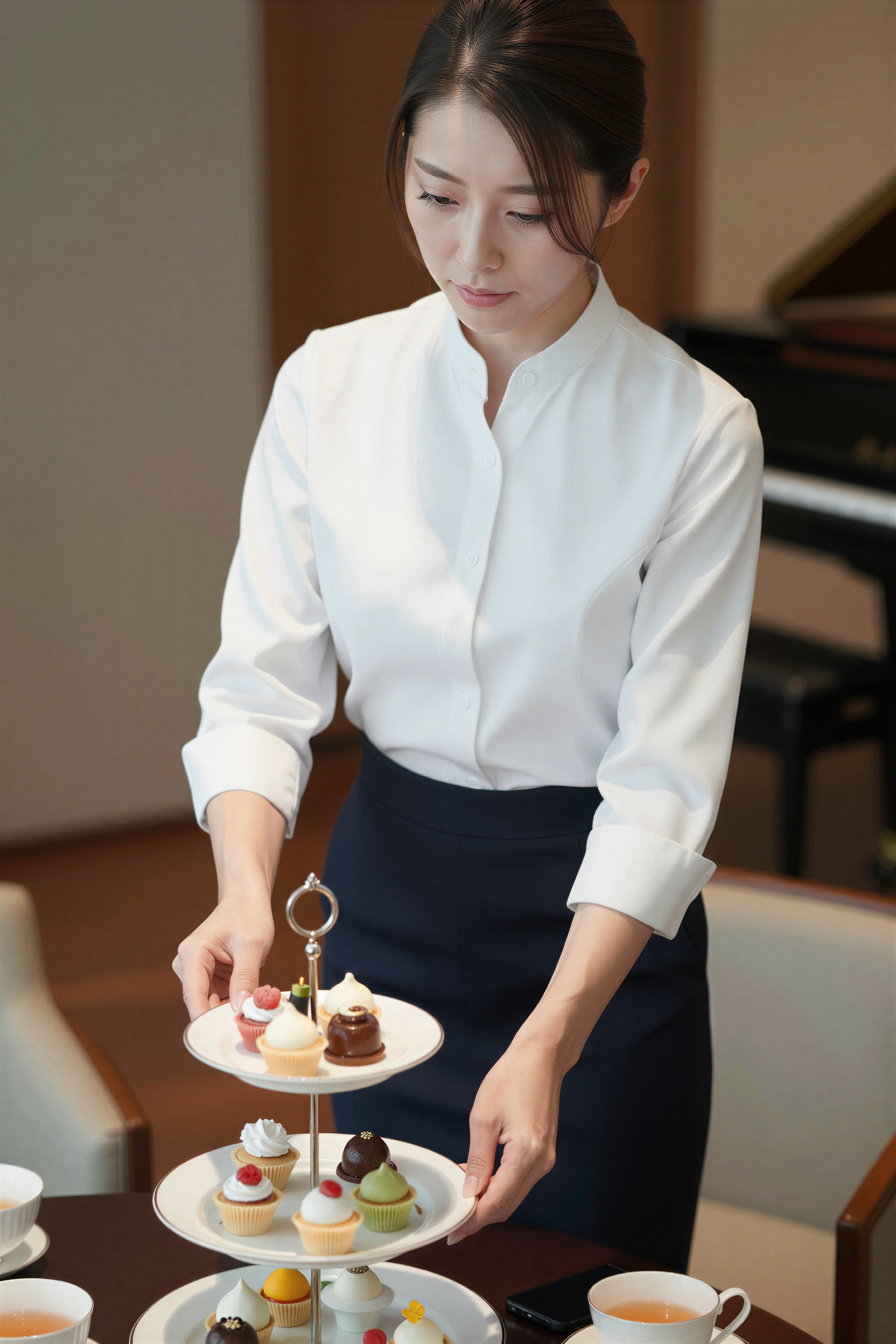 高級ラウンジでアフタヌーンティーセットを提供する日本人女性、エレガントなブラウス、段状のケーキスタンド、柔らかいピアノ音楽の雰囲気を着ている。高画質でフリーのNightStock素材です。商用利用可能・クレジット表記不要。