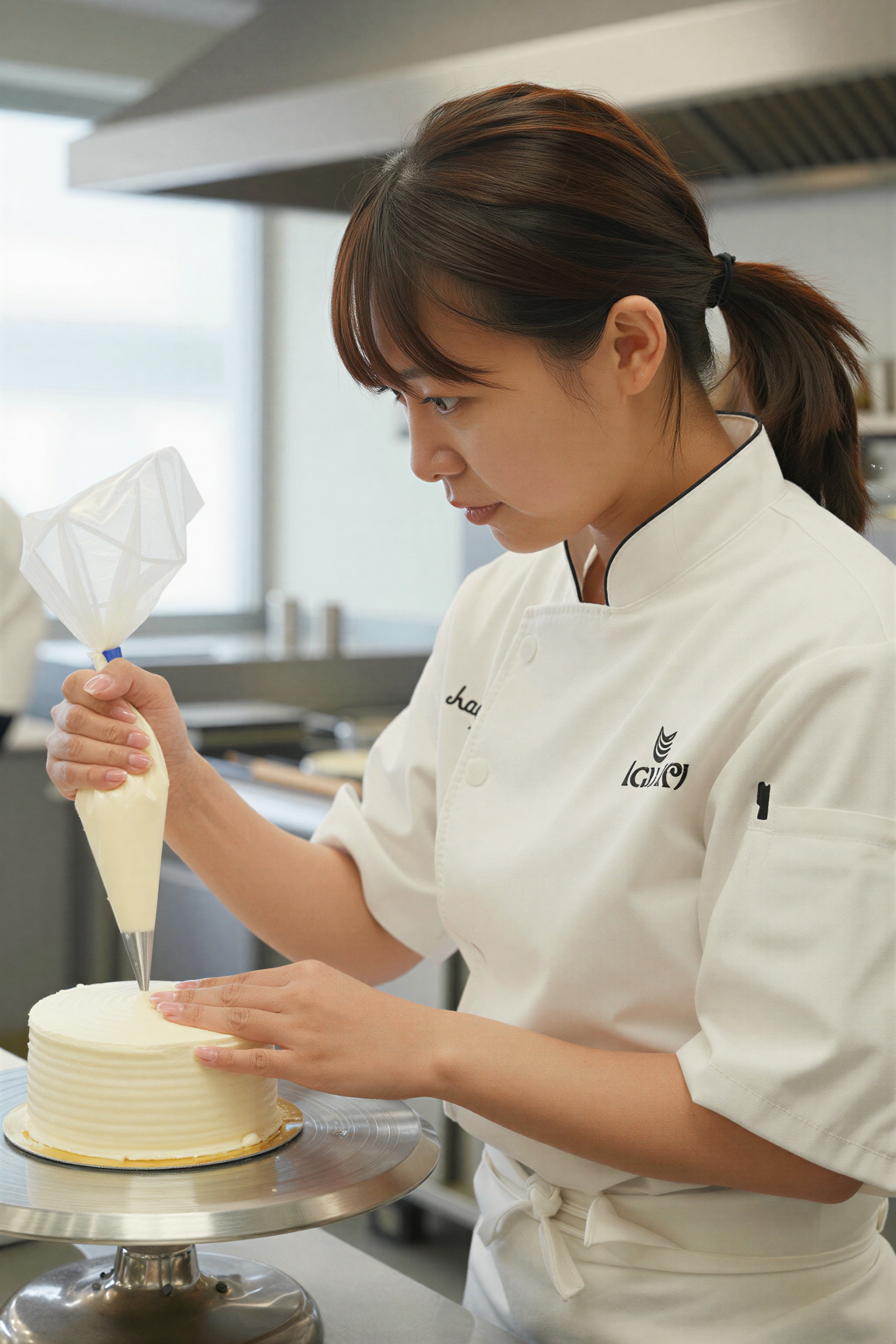 ホテルのキッチンでケーキを飾る日本人女性パティシエ、シェフの白、絞り袋、真っ白な作業場を着ている。高画質でフリーのNightStock素材です。商用利用可能・クレジット表記不要。