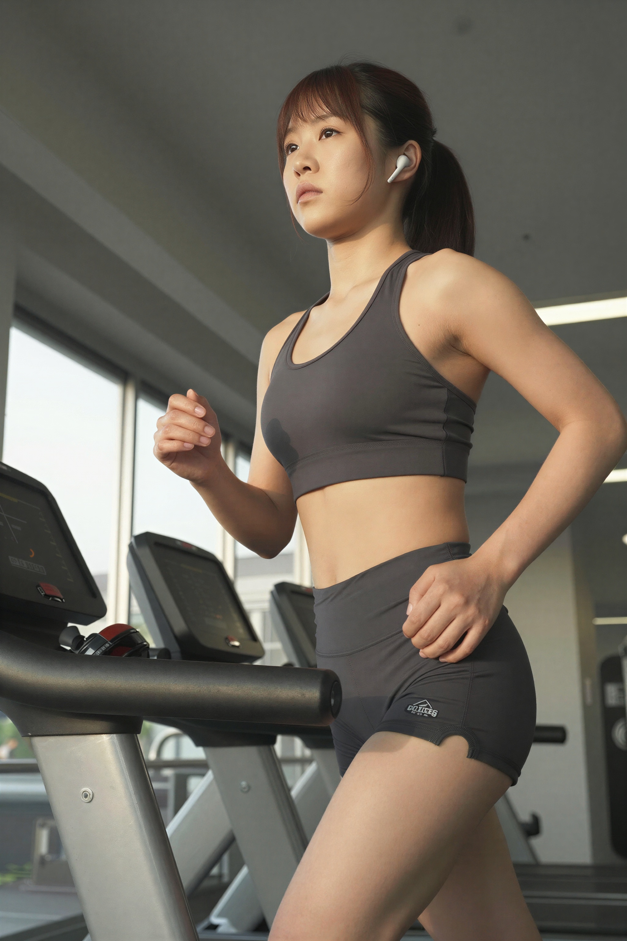 ジムのトレッドミルで走る日本人女性、スポーツウェアを着て、イヤホンを付け、デジタルディスプレイに統計情報を表示。高画質でフリーのNightStock素材です。商用利用可能・クレジット表記不要。