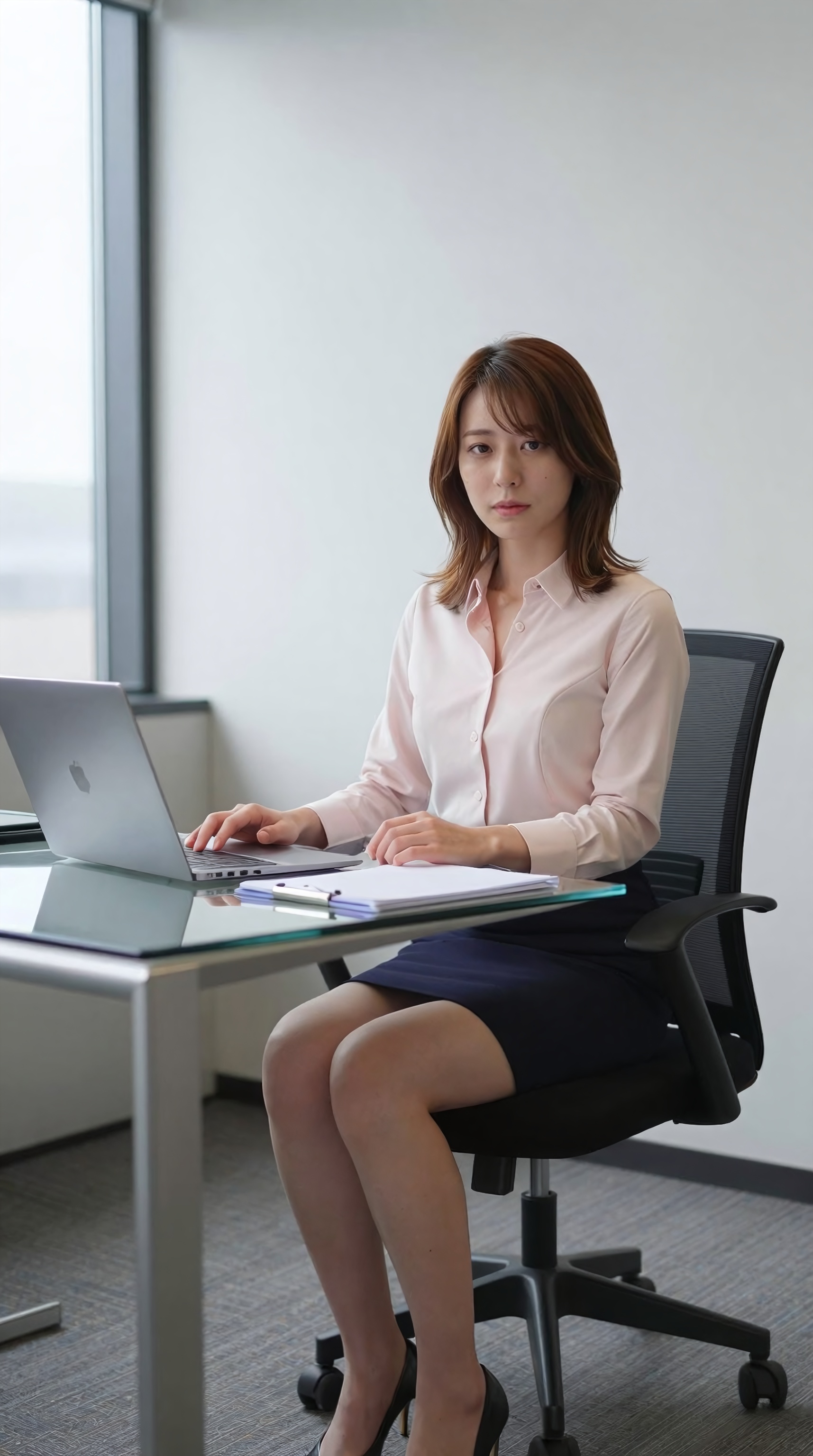 美しい日本人女性。若い日本人女性が、太陽の光が降り注ぐオフィスのモダンなガラス製の机に腰を下ろし、落ち着いたプロフェッショナルな表情で視線をまっすぐ前に向けています。彼女は、ぴったりとフィットするライトピンクの長袖の襟付きブラウスを着ており、太ももの真ん中まであるダークネイビーのペンシルスカートと黒の尖ったつま先のヒールを組み合わせています。彼女の黒髪はきちんとしたボブにスタイリングされており、黒。。高画質でフリーのNightStock素材です。商用利用可能・クレジット表記不要。