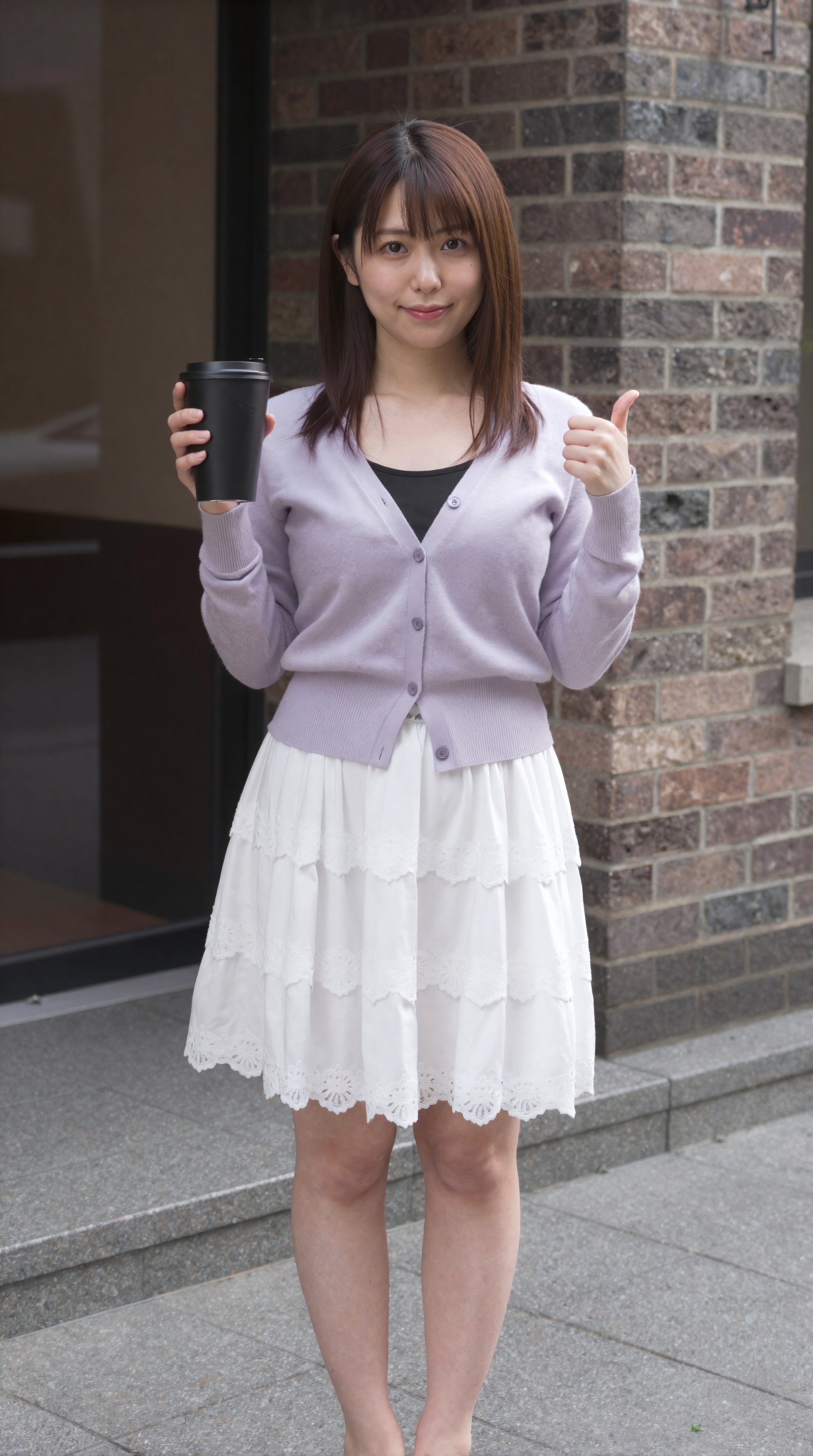 美しい日本人女性。若い日本人女性がレンガ造りの建物の前の舗装された歩道に立ち、右手に黒いトラベルマグを持ち、左手で親指を立てています。前髪のある黒髪のストレートロングヘアで、カメラを見つめながら優しく気持ちの良い笑顔を浮かべています。彼女は黒いトップスの上に薄紫の長袖カーディガンを着ており、裾に沿って繊細なレースのディテールとフリルのレイヤーが特徴の白い膝丈のスカートを組み合わせています。。高画質でフリーのNightStock素材です。商用利用可能・クレジット表記不要。