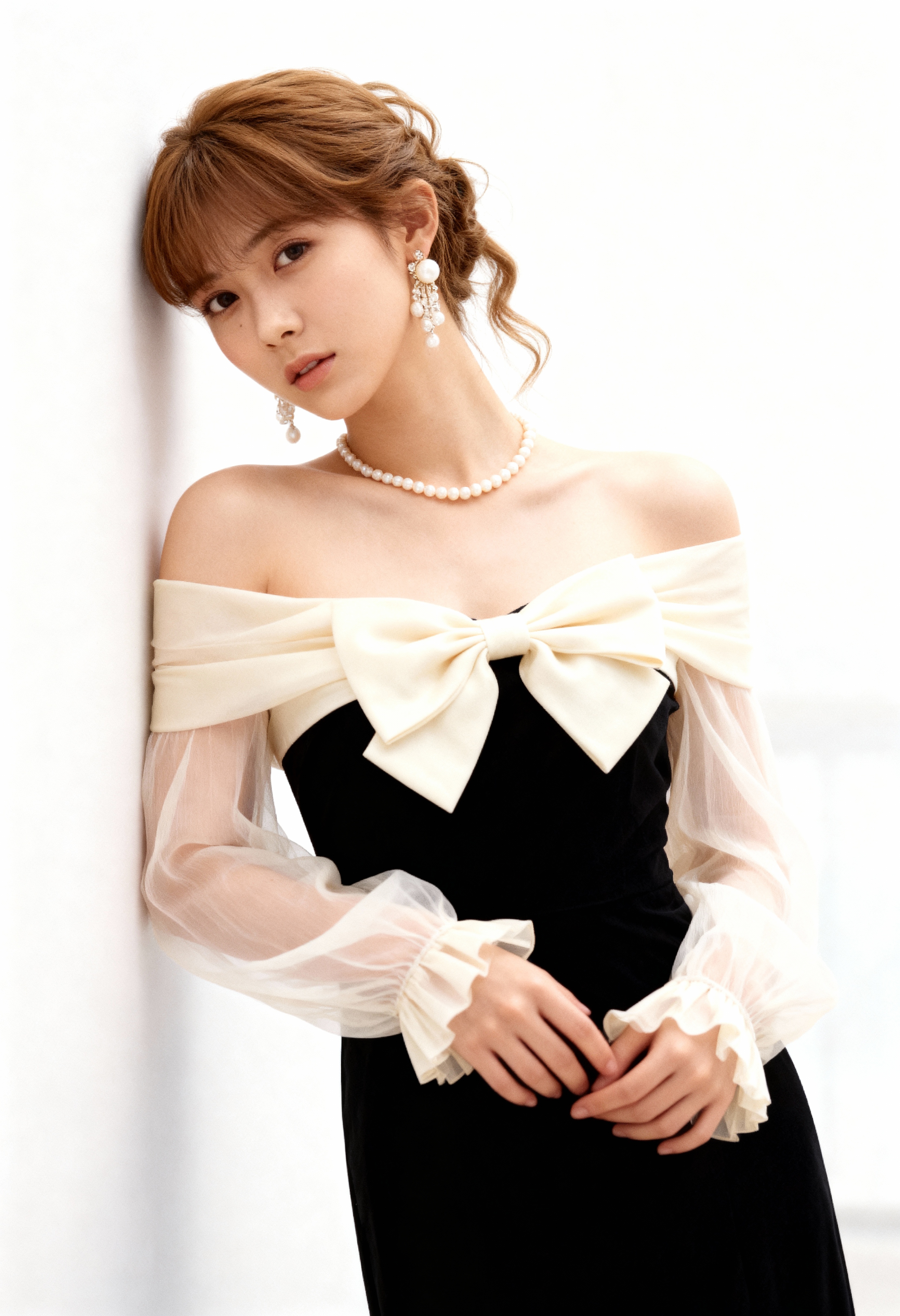 薄手の袖と大きなリボンが付いたフォーマル ドレスを着て、真っ白な壁に向かってポーズをとる若い女性をポートレート アングルから写実的に撮影したもの。画像の中央には、白い肌、緩いカールに整えられた茶色の髪、中性的な表情を持つ 20 歳の女性が、大きな白いリボンが付いた黒いオフショルダーのドレスと真珠のネックレスを着ています。彼女は胸の前で手を組んで立ち、茶色の目でカメラを直接見つめています。髪はきちんとアップスタイルにまとめ、パールのイヤリングを付けています。背景はぼやけていますが、窓から自然光が差し込む屋内の設定のように見えます。そのイメージは、女性のエレガントで洗練された外観に焦点を当てた、柔らかく優美な品質を持っています。
