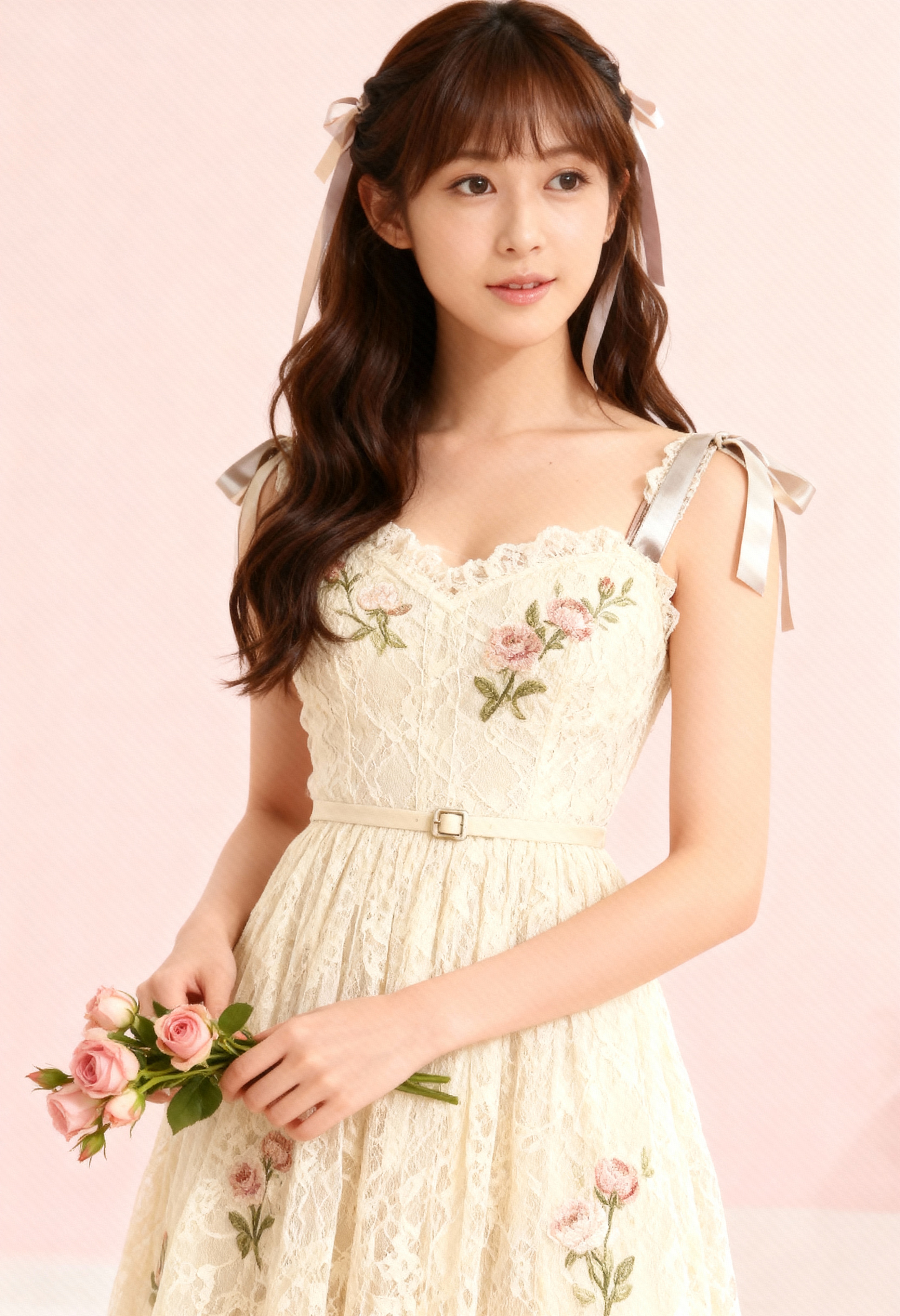 花の刺繍が施された白いレースのドレスを着て、ピンクのバラの花束を持った若い女性をポートレート カメラ アングルから写実的に撮影したもの。この画像には、柔らかいパステル カラーの明るいピンクの背景も示されています。画像の中央では、ウェーブのかかった茶色の長い髪、茶色の目、中性的な表情をした 16 歳の女性がカメラの前に立っています。彼女は口元にわずかな笑みを浮かべて視聴者をまっすぐに見ているように見えます。彼女の髪はゆるやかなウェーブでスタイリングされており、色は明るい茶色です。彼女は花柄の刺繍が施された明るいクリーム色のドレスと銀のバックルが付いた白いベルトを着ています。ドレスはスクエアネックで肩にライトグレーのリボンが巻かれています。女性は左手に小さなピンクのバラを持っています。